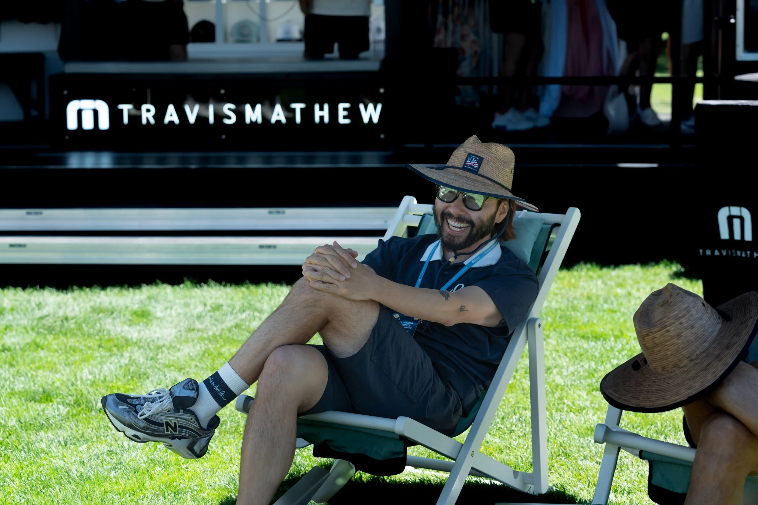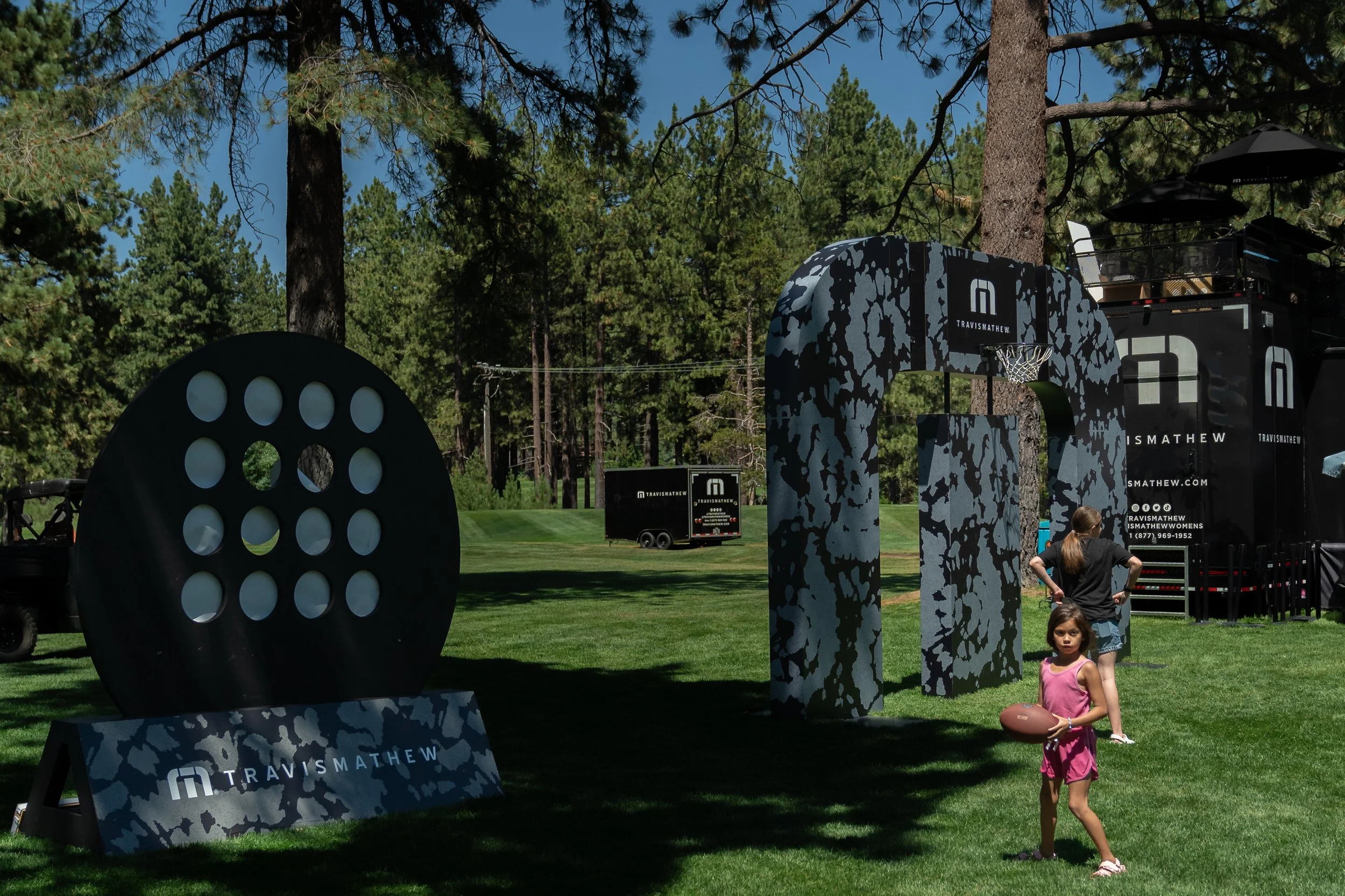 People at an outdoor event with a TravisMathew sports-themed installation and large trees in the background.