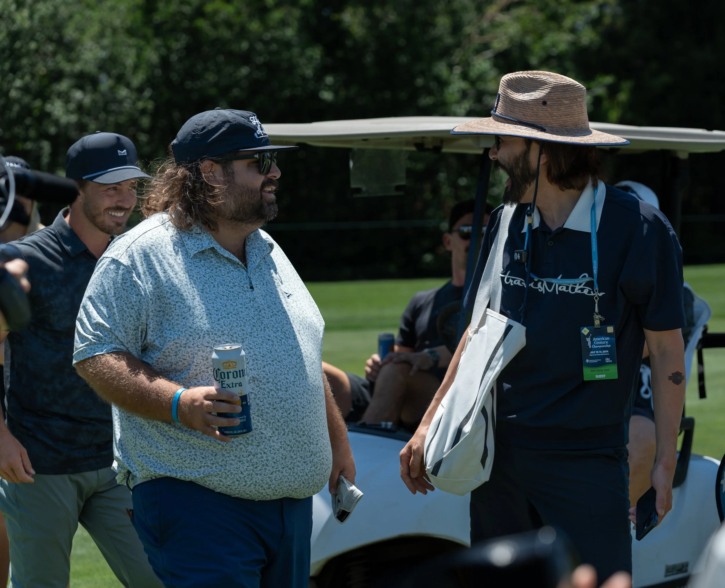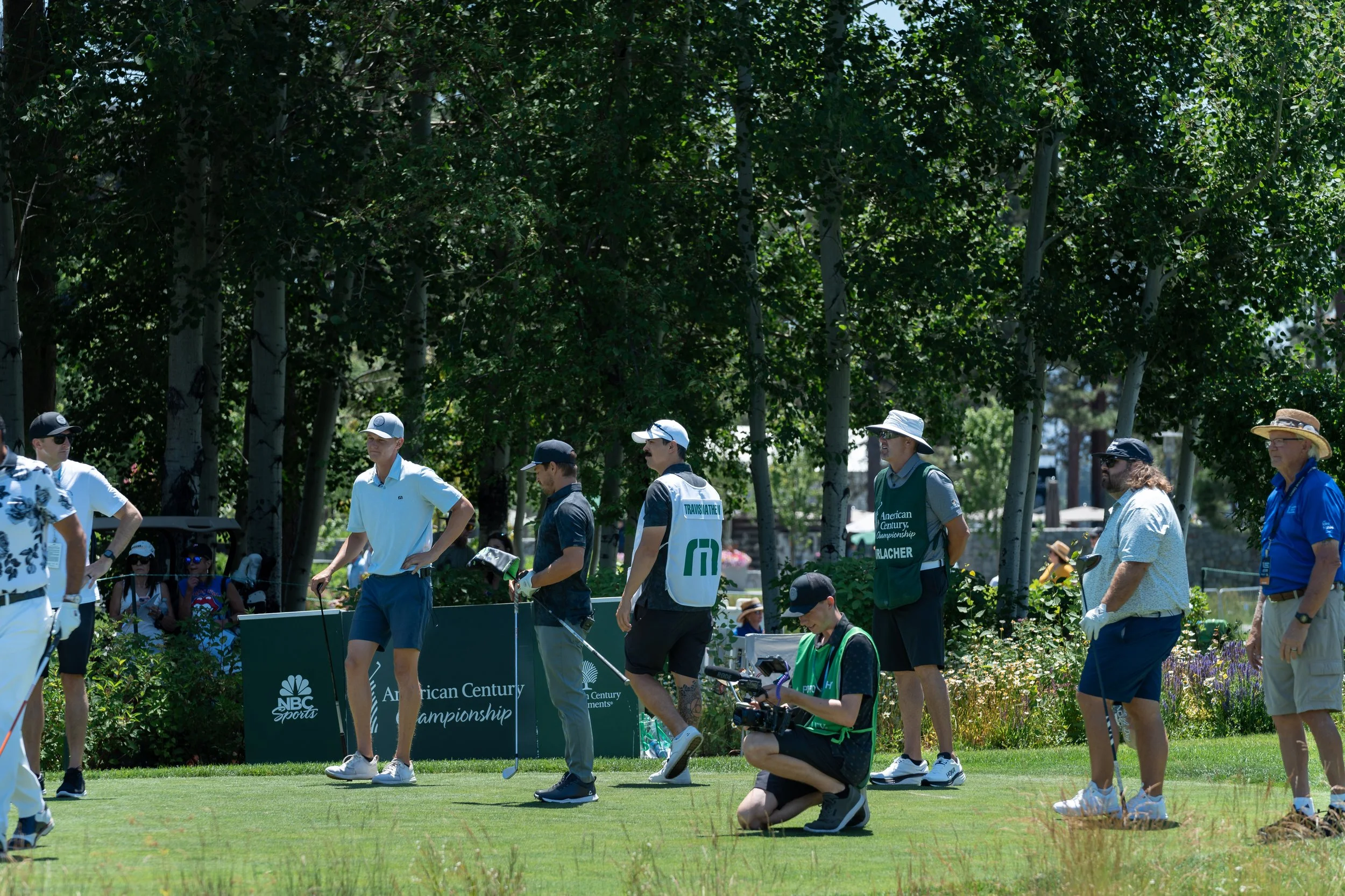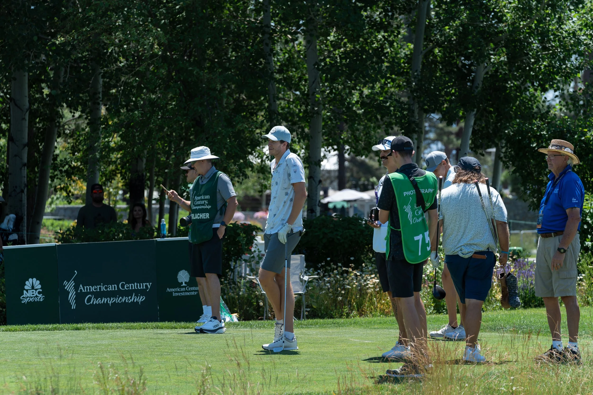 A group of people at the American Century Championship golf tournament, with golfers and caddies standing on a grassy area near a sign. Trees and spectators in the background.