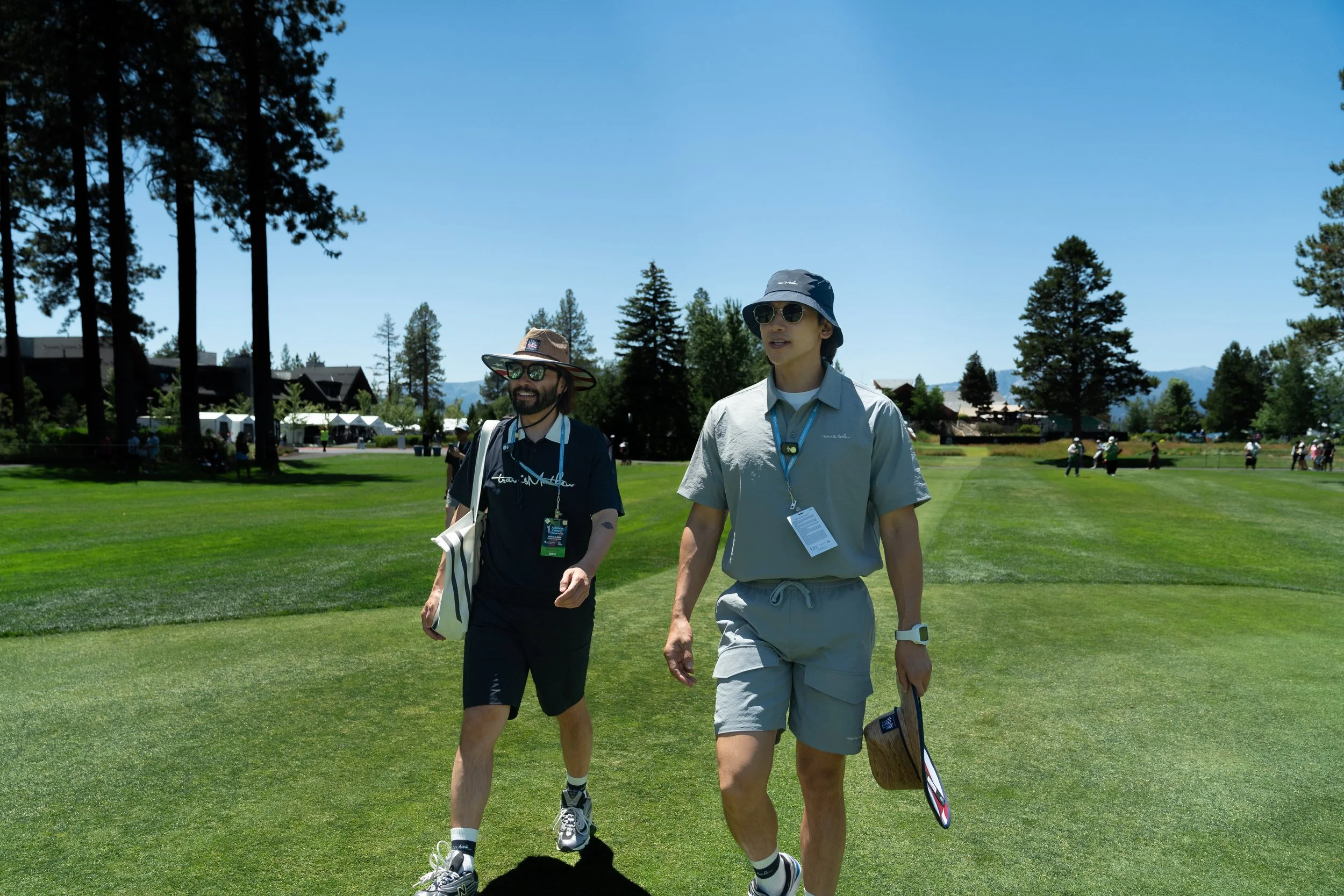 Two people walking on a golf course, wearing casual outdoor attire and sunglasses, with trees and buildings in the background on a sunny day.