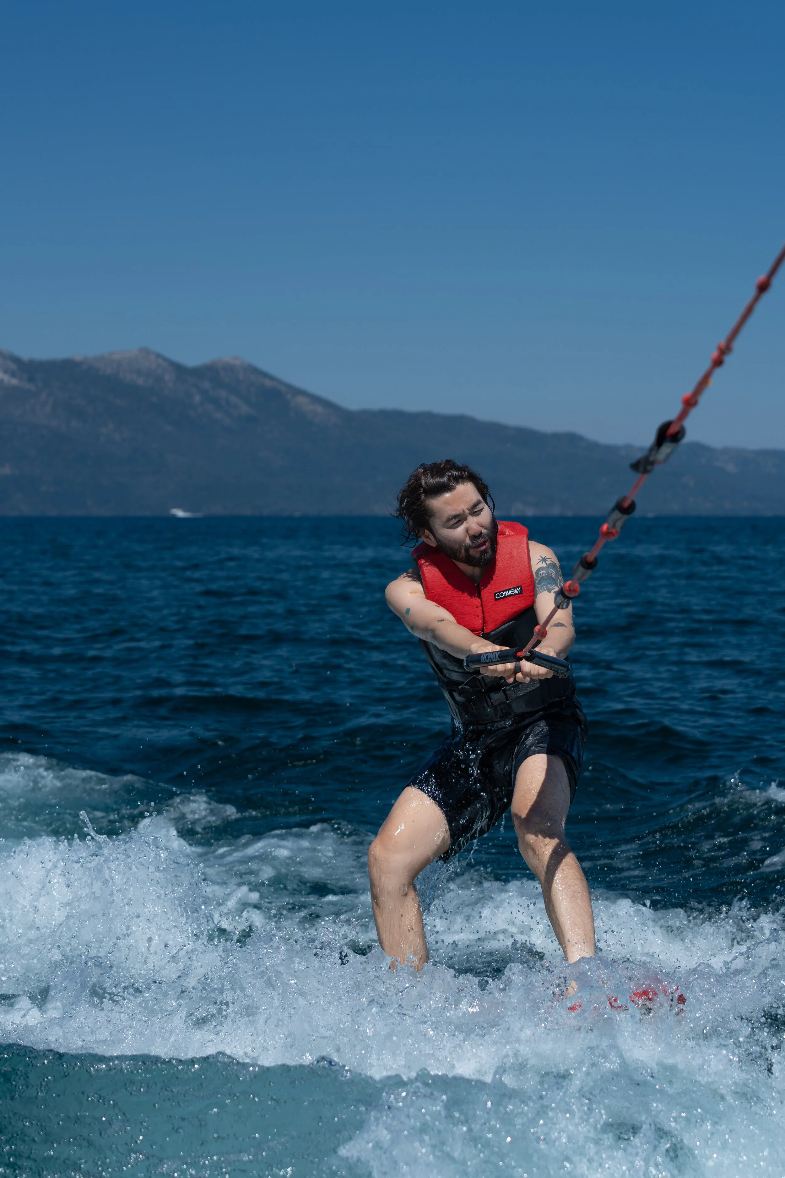 Person wakeboarding on a lake with a red life jacket and mountains in the background.