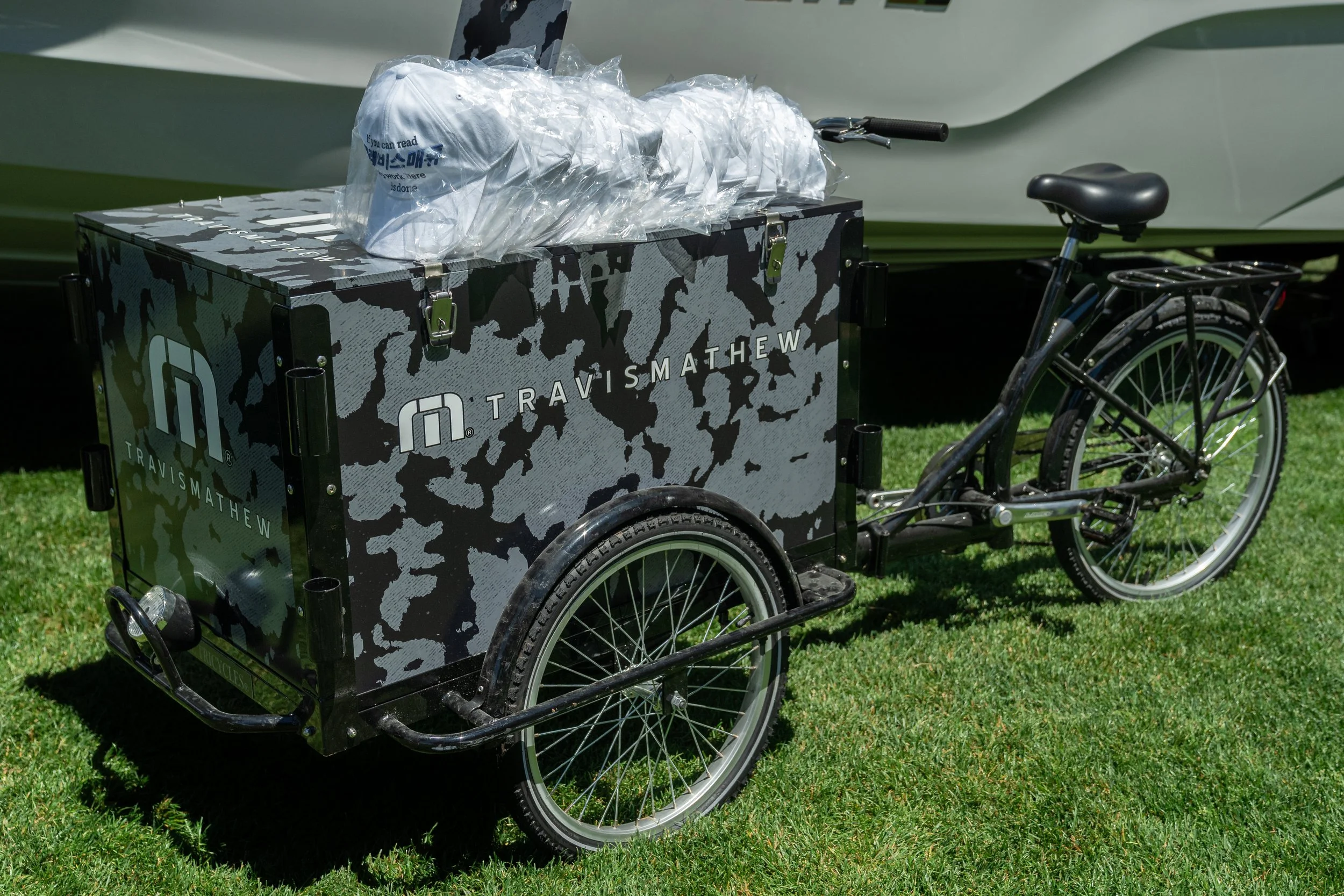 Three-wheeled bicycle with a camouflage cargo box labeled "TravisMathew" on grass, with stacked wrapped items on top.