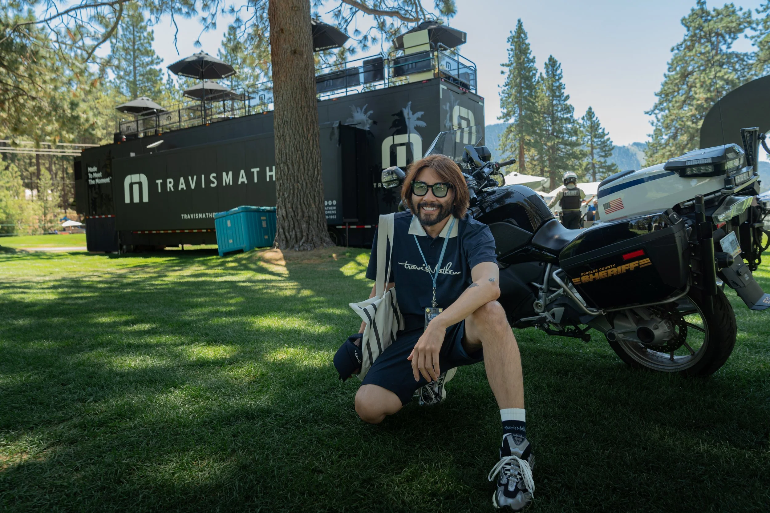 Person wearing a TravisMathew outfit kneeling on grass, with a sheriff motorcycle and TravisMathew branded trailer in the background. Outdoor setting with trees.