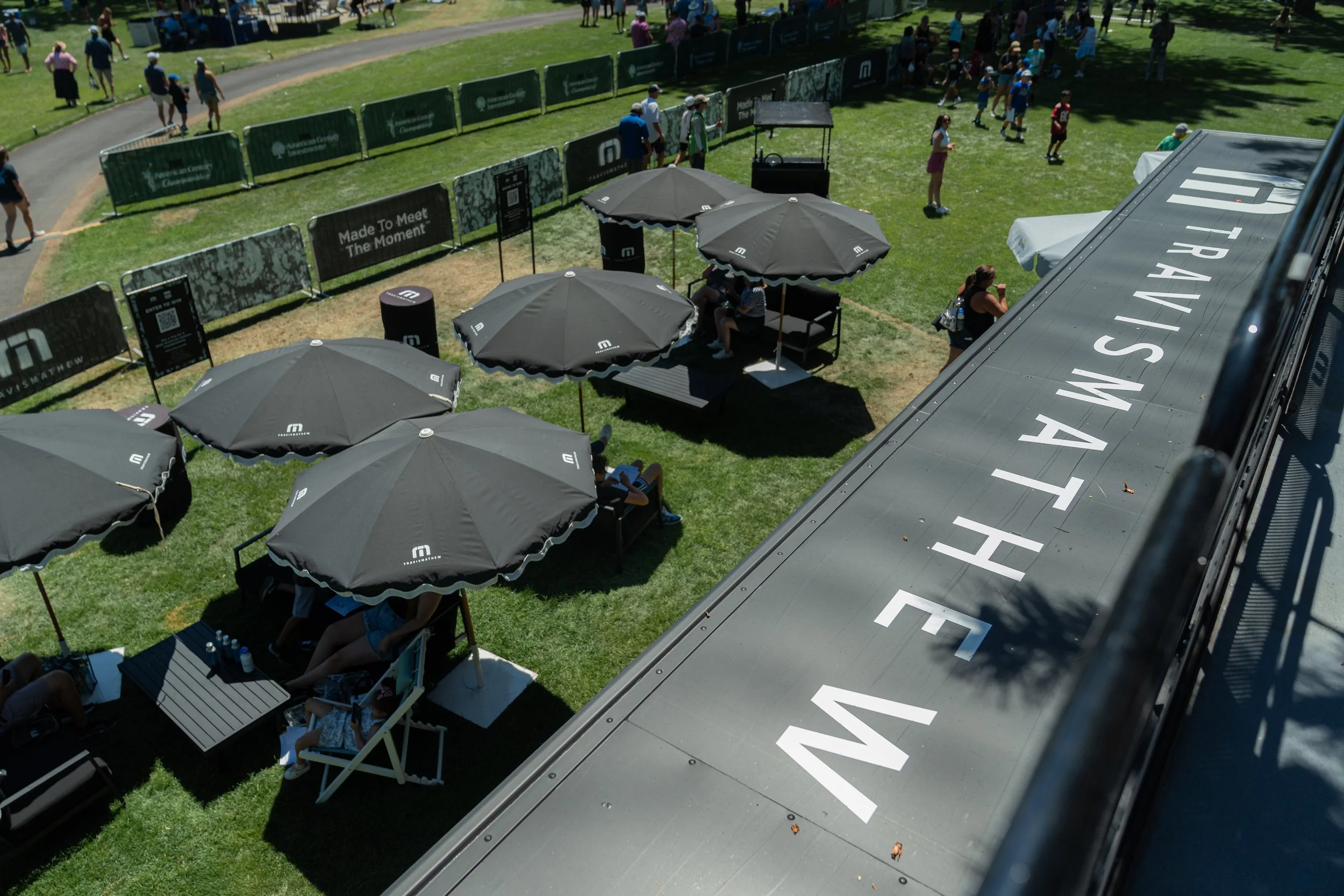 Outdoor event area with black umbrellas and TravisMathew branding, surrounded by green grass and people walking.
