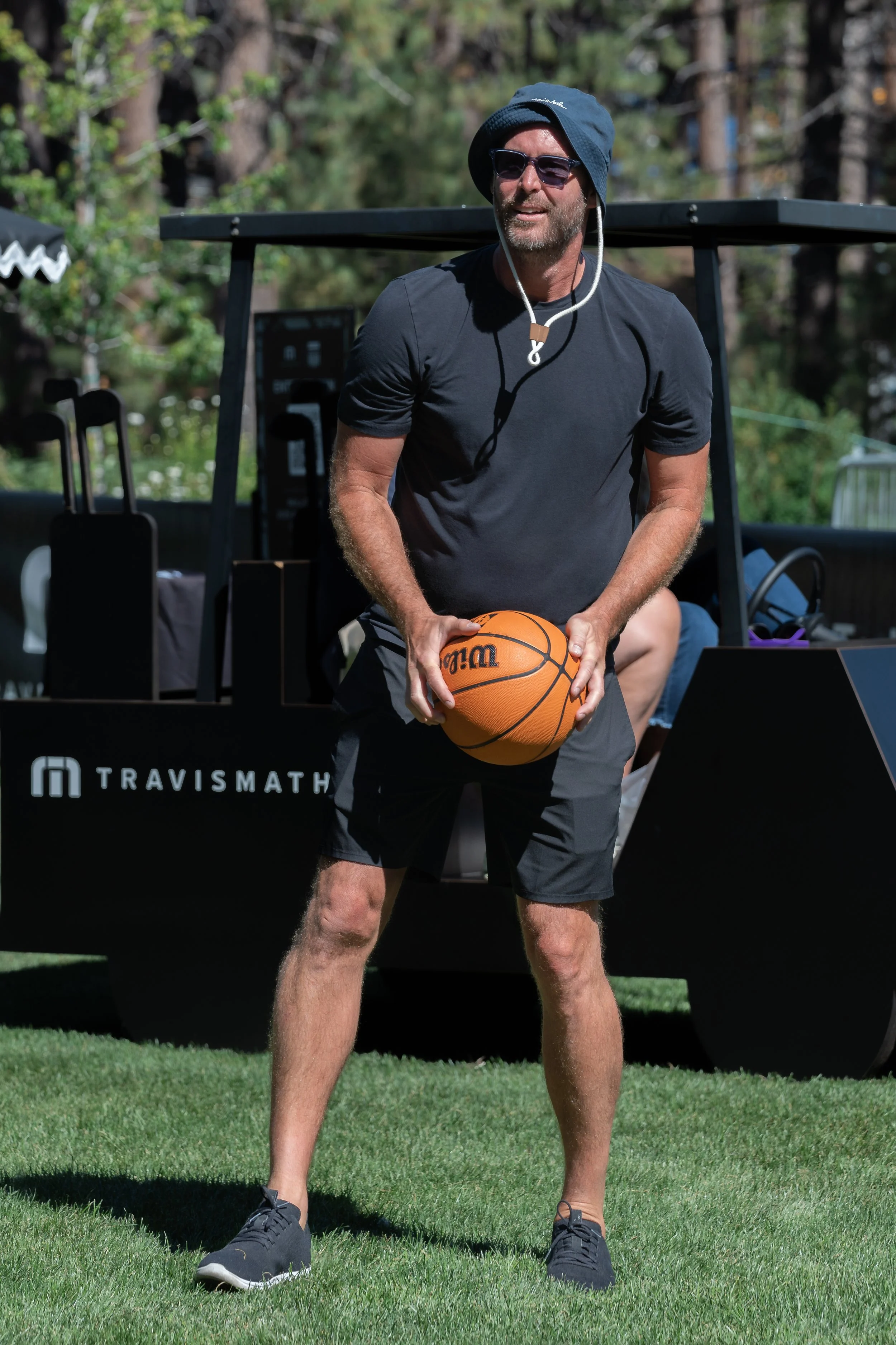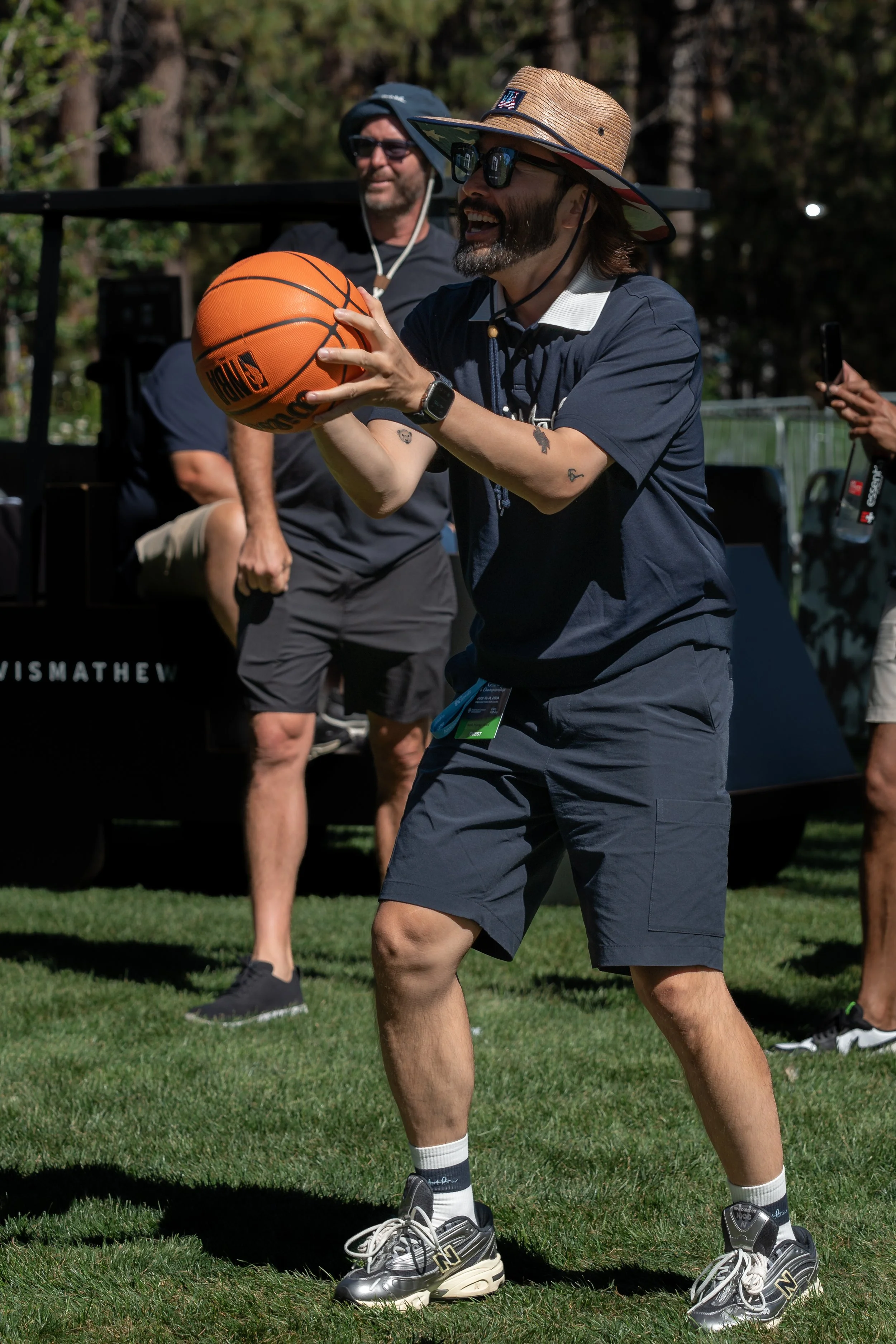 Man wearing a bucket hat and sunglasses, holding a basketball on a grassy field. Black golf cart with TravisMathew branding in the background. Trees and greenery visible.