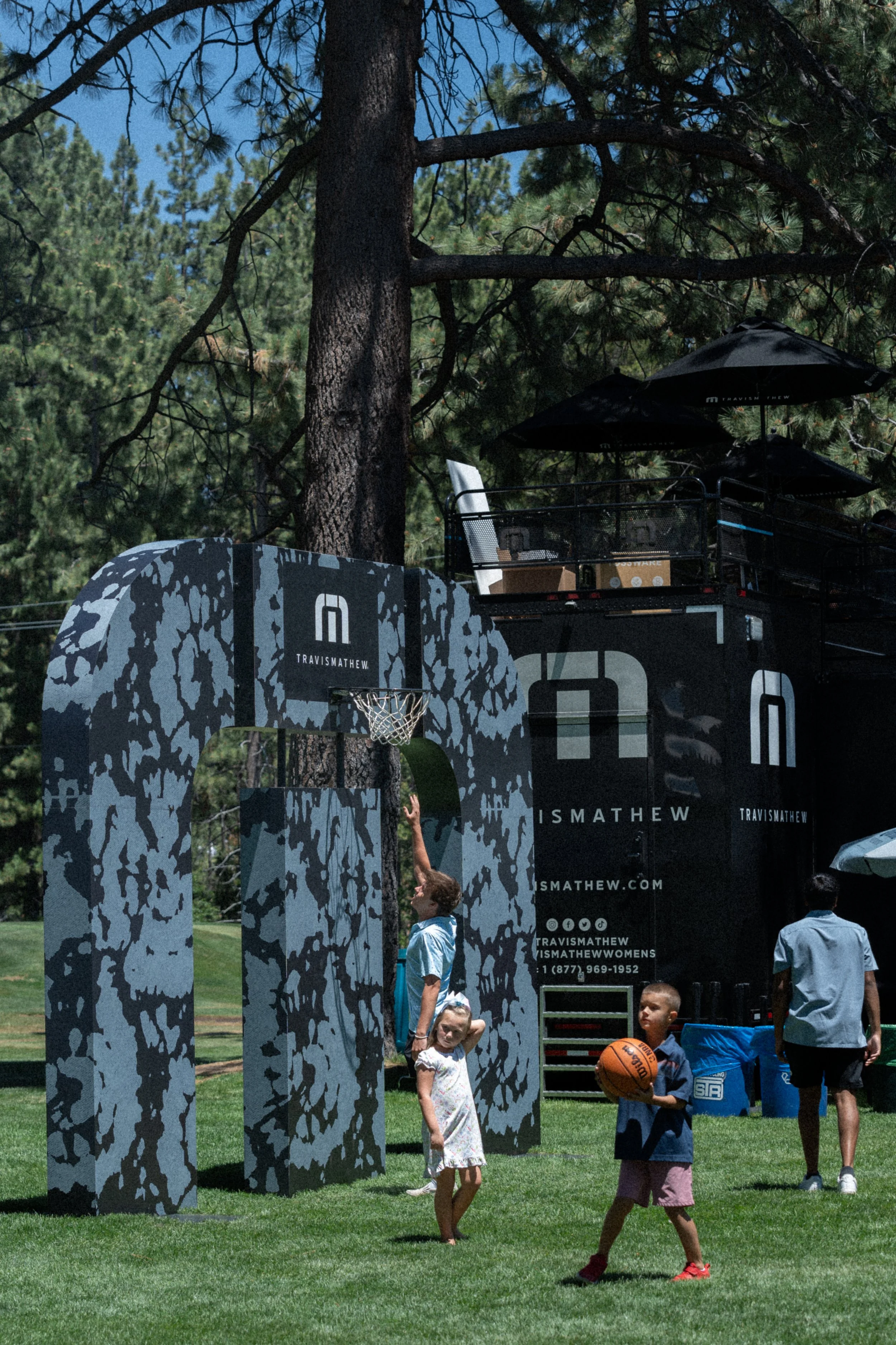 Outdoor event with children playing basketball, large Travis Mathew structure, forest background