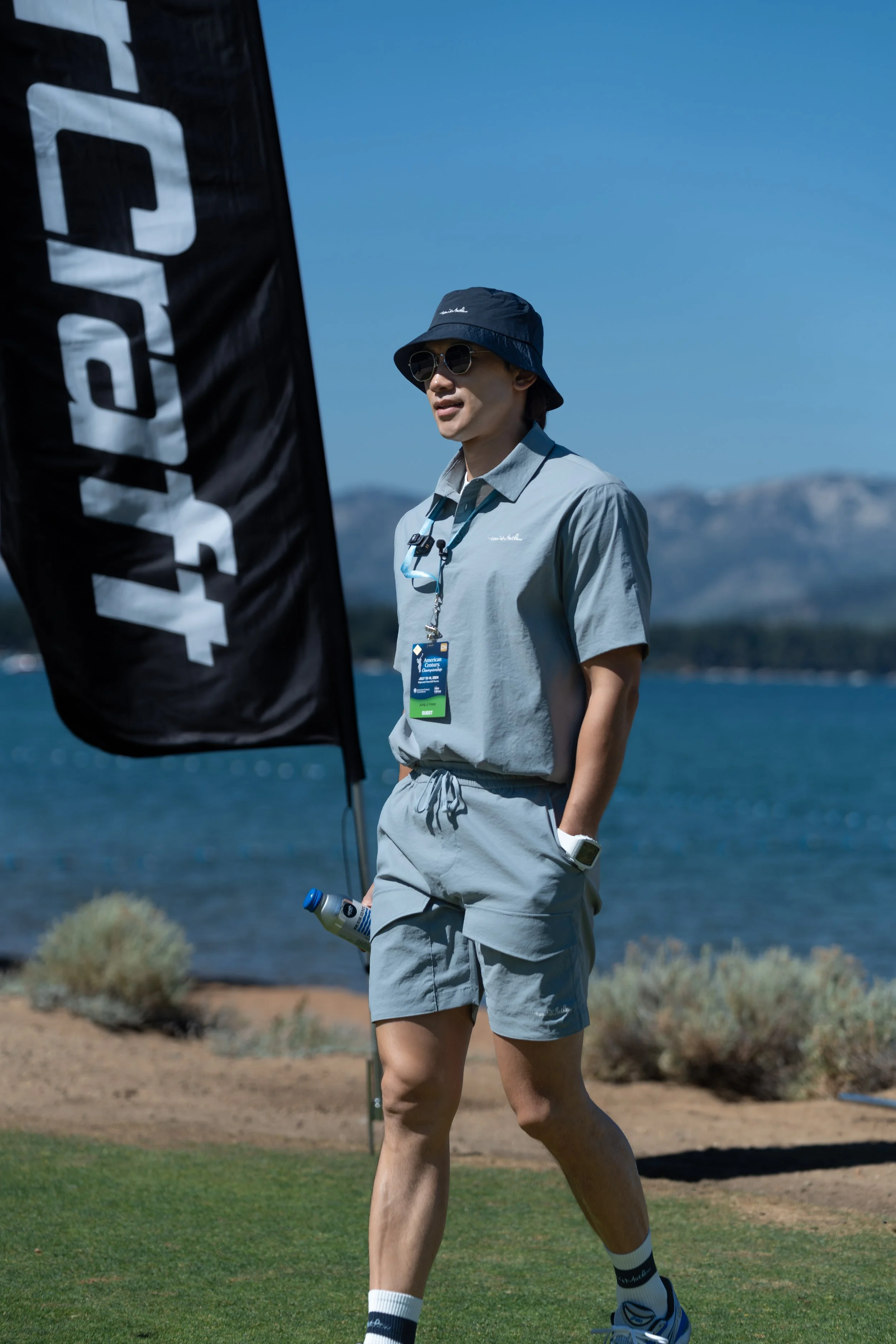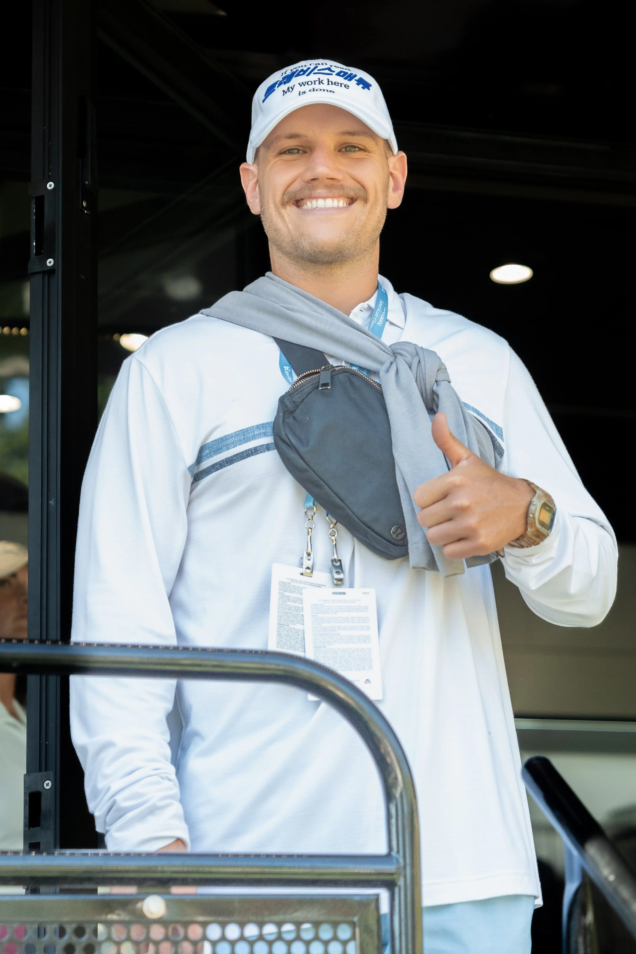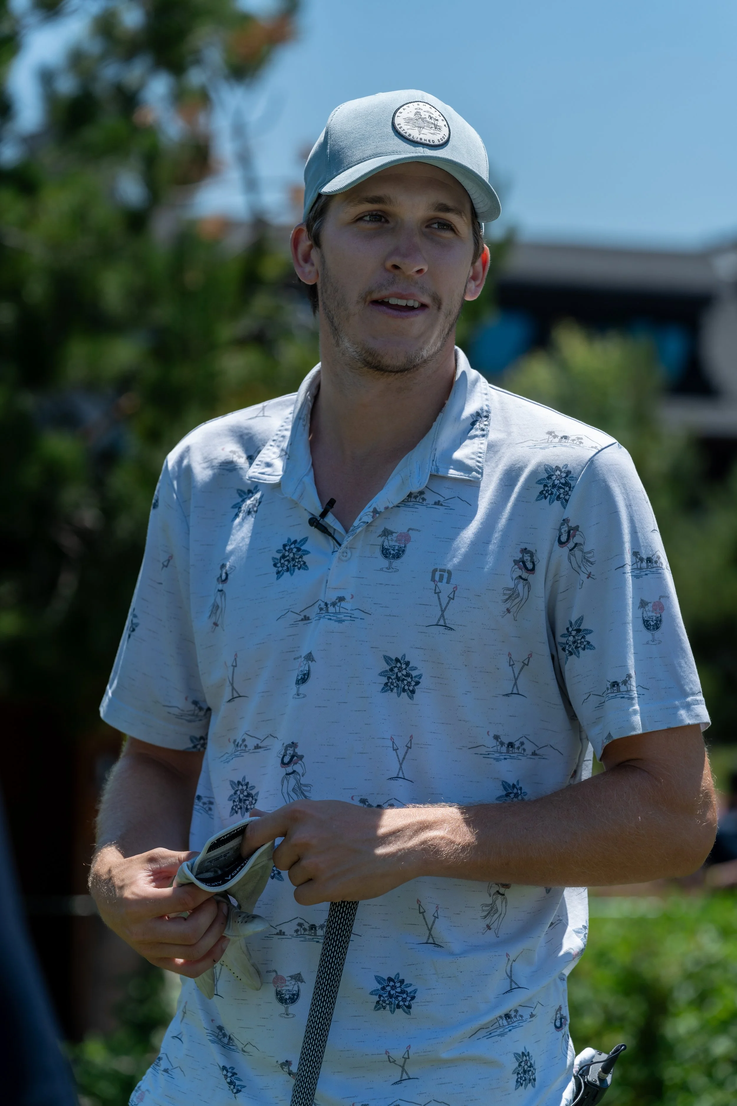Close-up of a person wearing a gray TravisMathew shirt with a blue American Century Championship lanyard and a microphone attached to the collar, set against a blurred outdoor background.