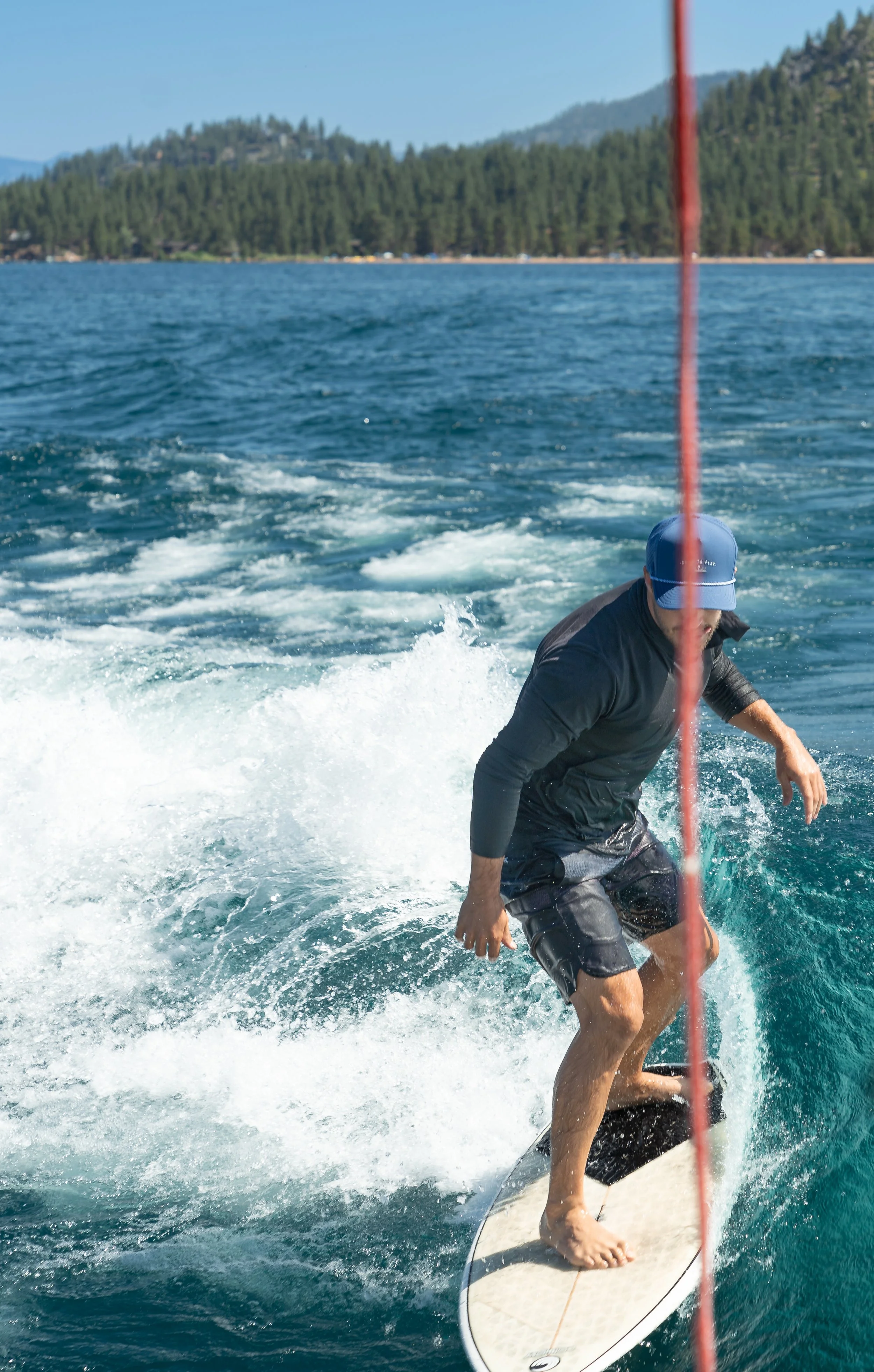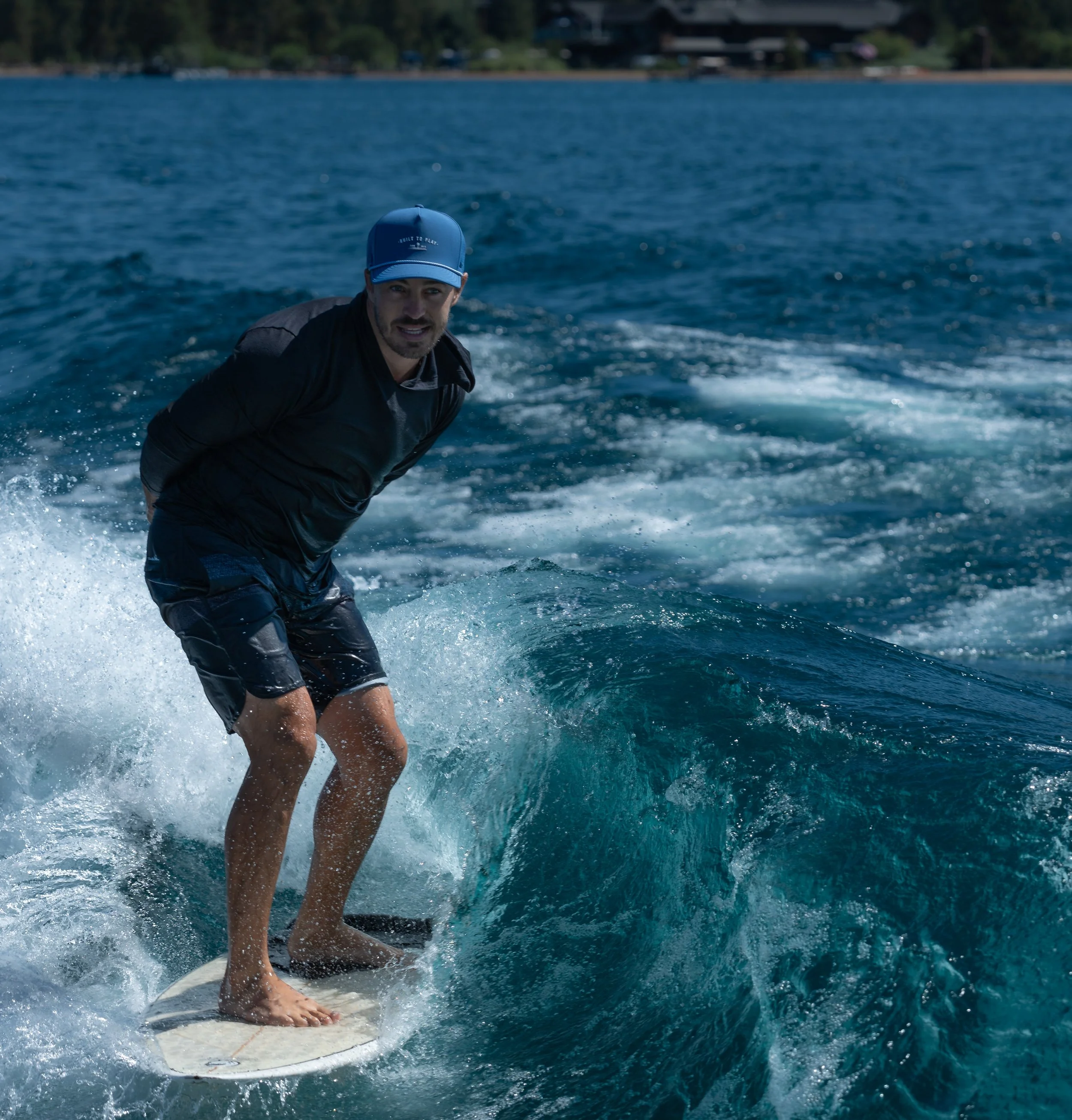 Man surfing on a wave with a blue cap and black outfit, in a sunny outdoor setting.