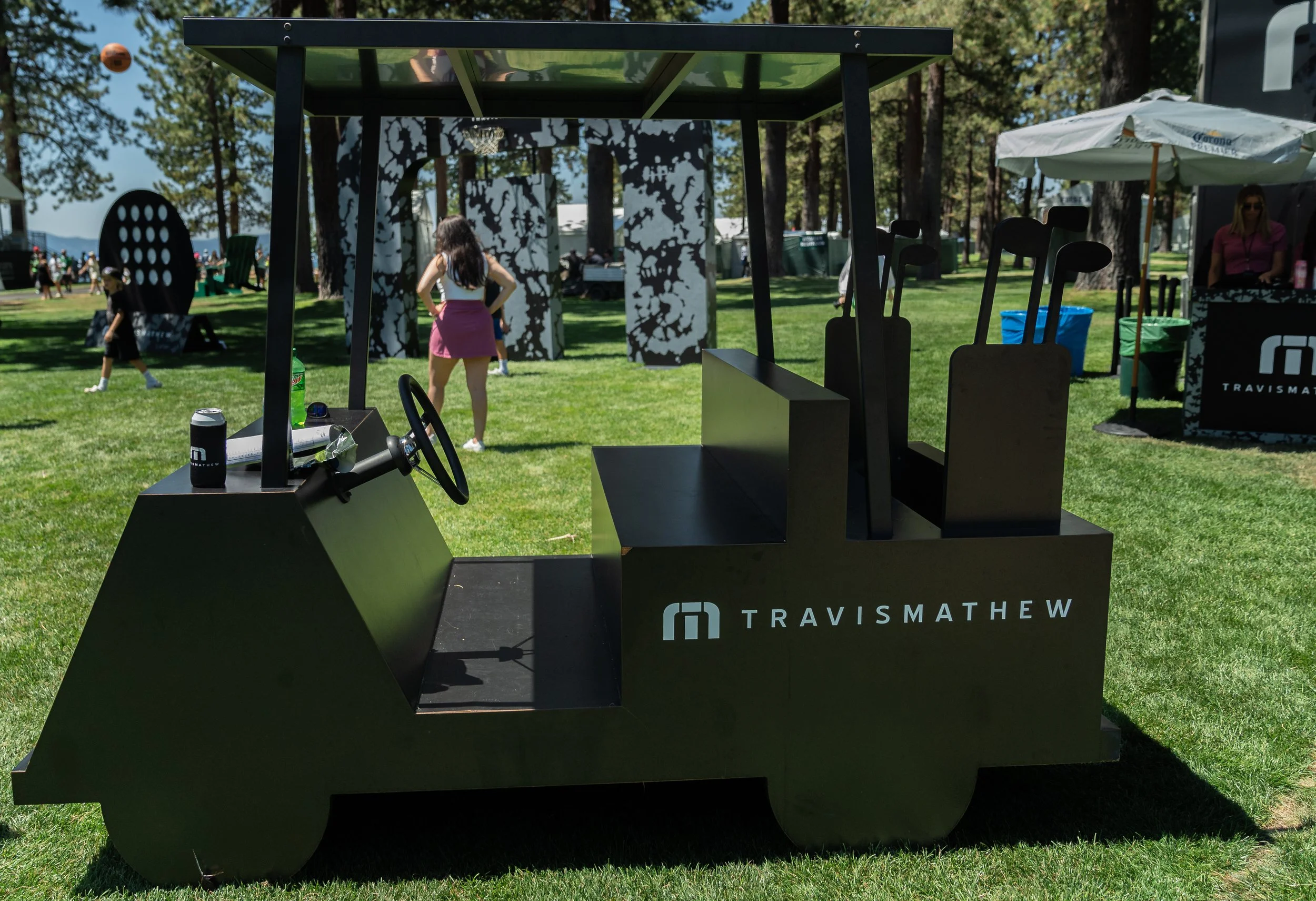 An outdoor scene with a black golf cart-style display featuring the TravisMathew logo. The cart is equipped with a steering wheel, cup holder, and golf bag holders. People are in the background, and there are trees and a promotional booth nearby.