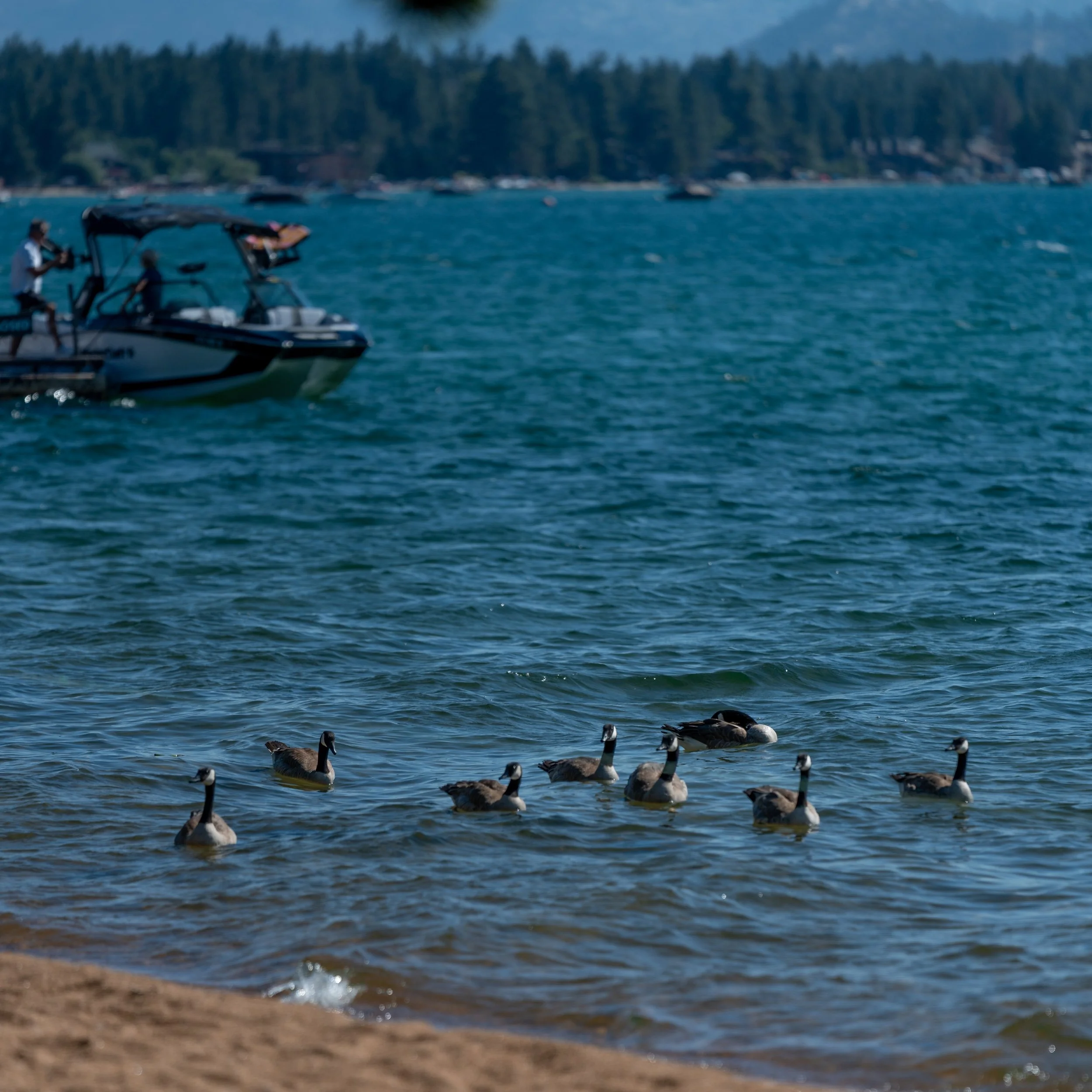 A group of Canada geese swimming near the shore of a lake with a boat in the background. The scene includes a forested shoreline and distant mountains.