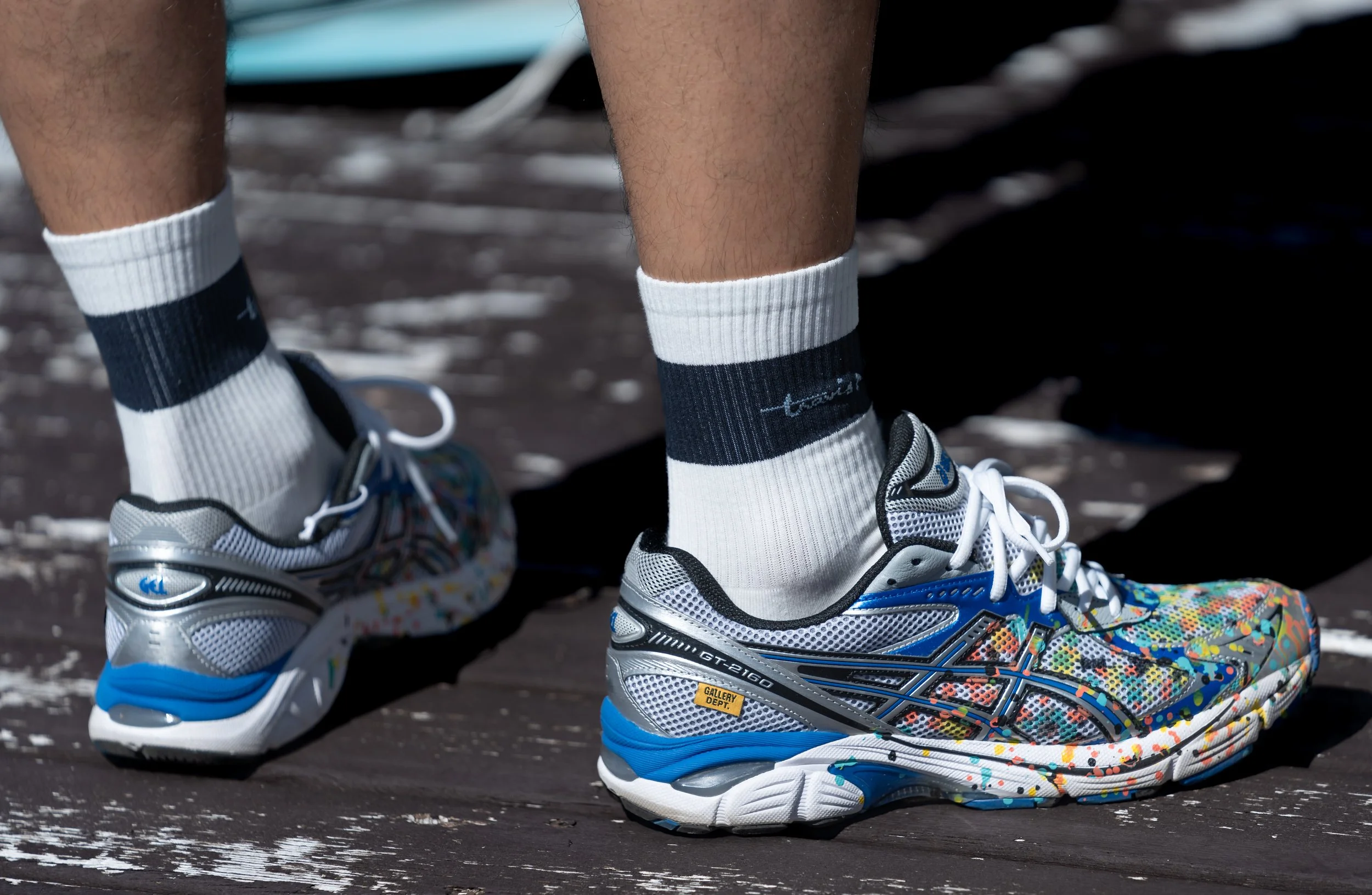 Person wearing colorful athletic sneakers with white and black socks, standing on a wooden outdoor surface.