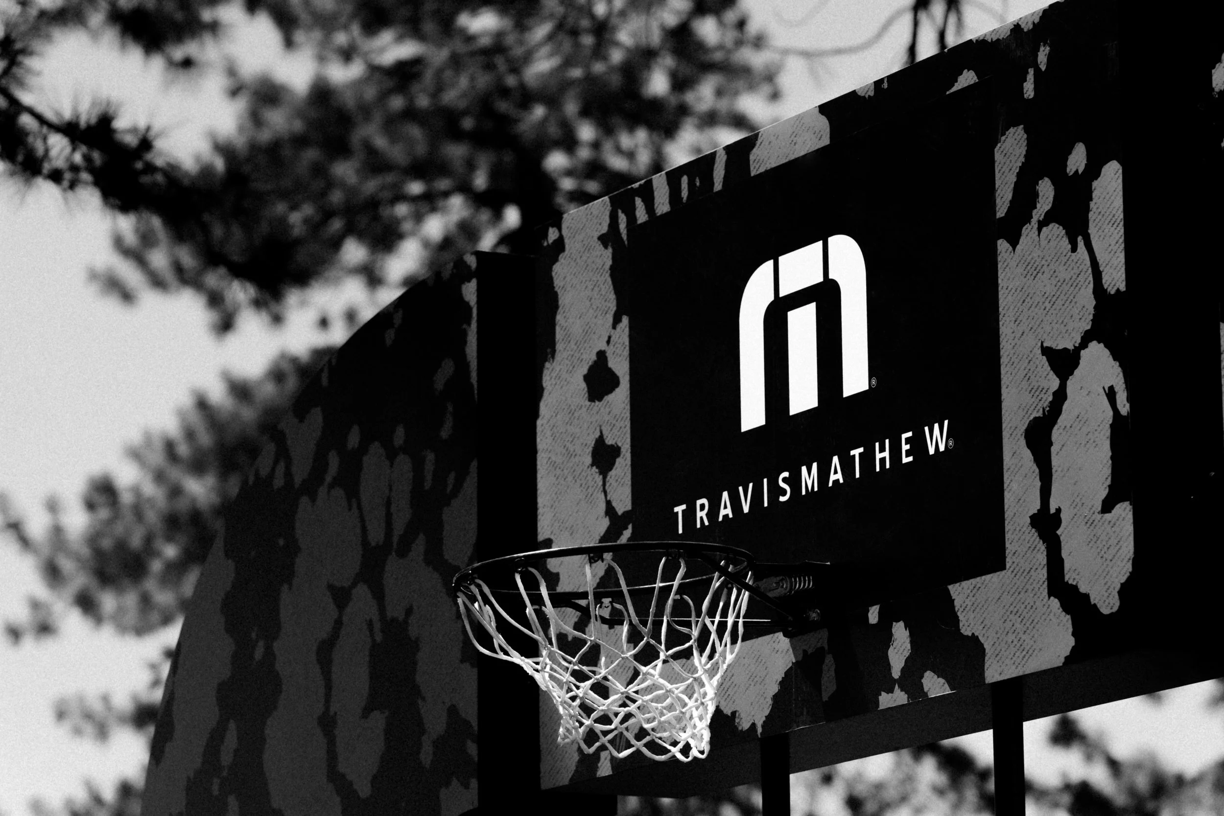 Black and white image of a basketball hoop with a Travis Mathew logo on the backboard.