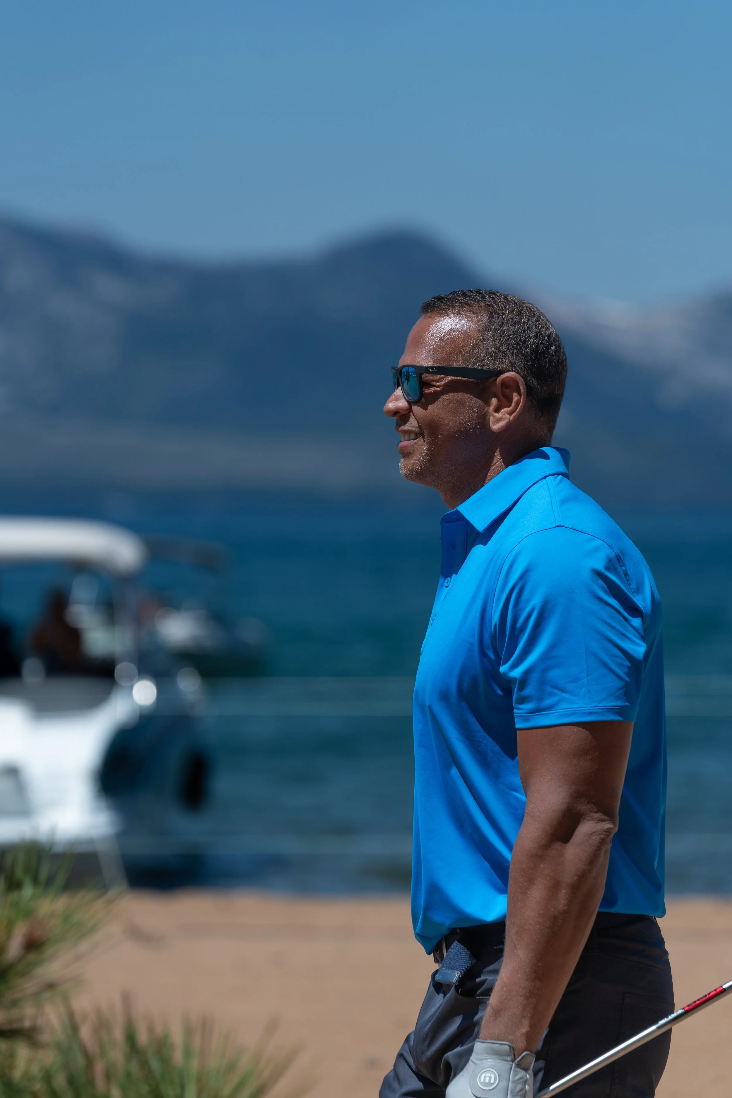 Man in blue shirt and sunglasses holding a golf club by a lakeside with mountains in the background.