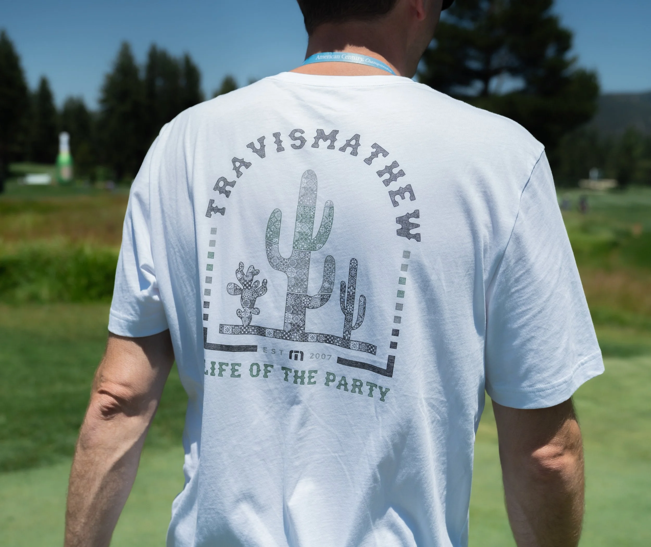 Man wearing a white T-shirt with a cactus design and the text "TravisMathew Life of the Party" outdoors on a sunny day.