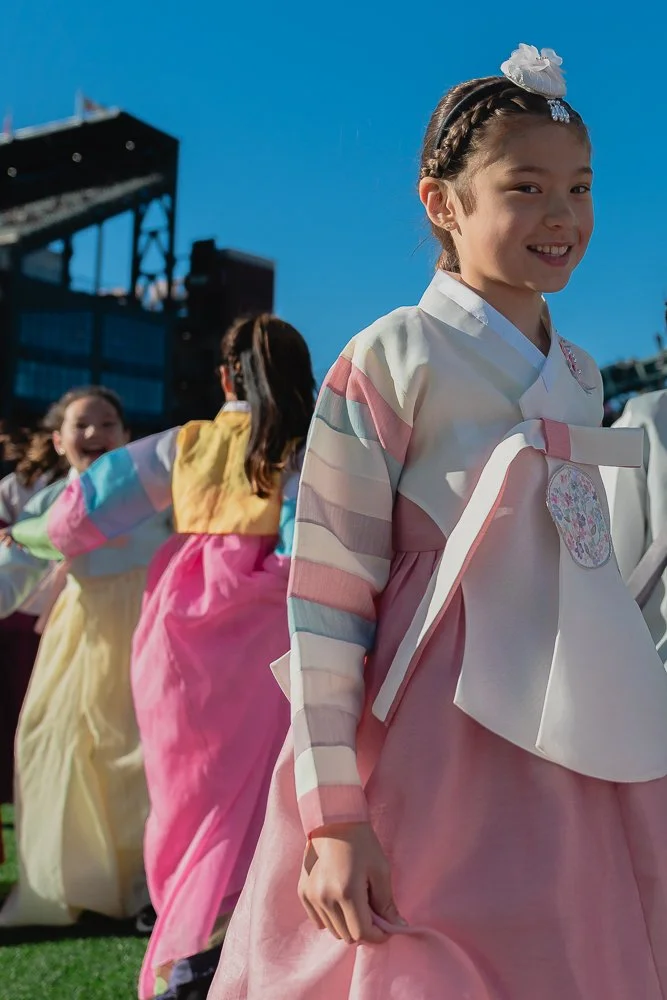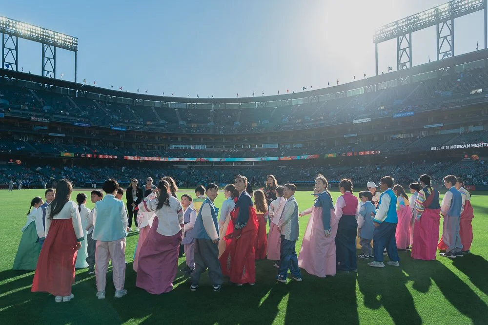 Children wearing traditional Korean hanboks walking on a baseball field during a cultural event, with a stadium and crowd in the background.
