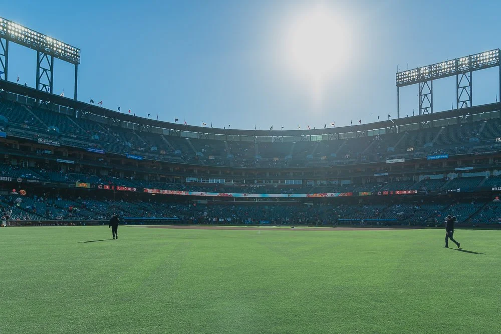 Baseball stadium with empty field and sun shining, people walking on grass, stadium lights on, partially filled stands, clear sky.