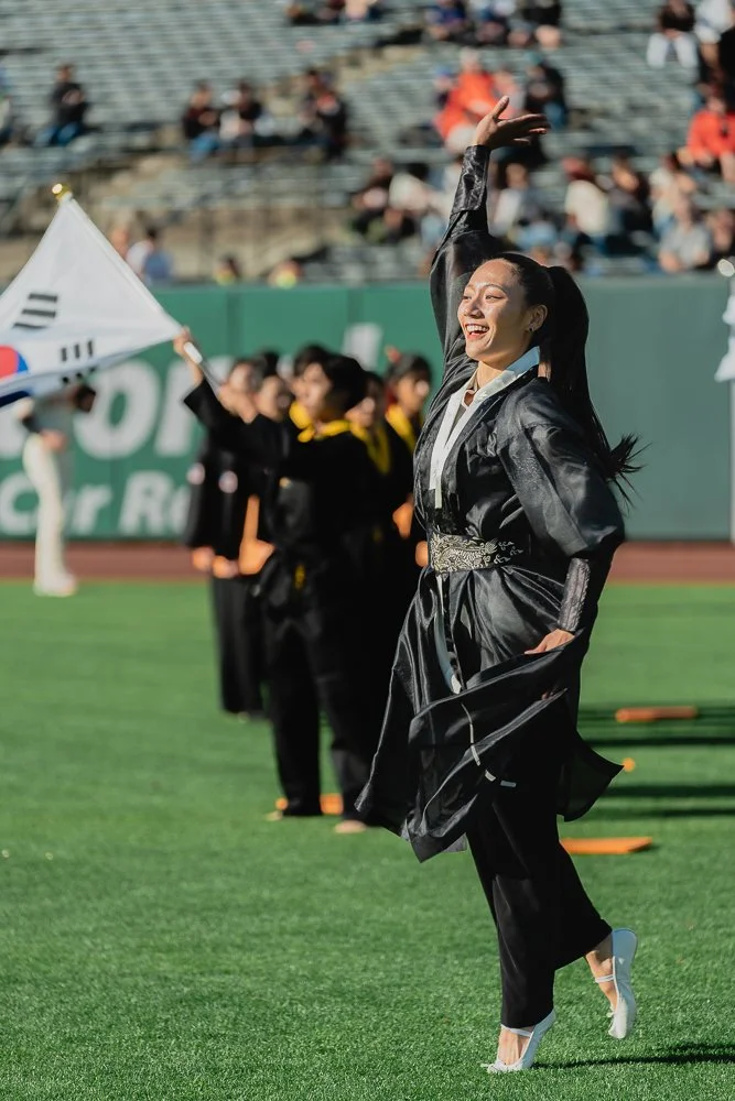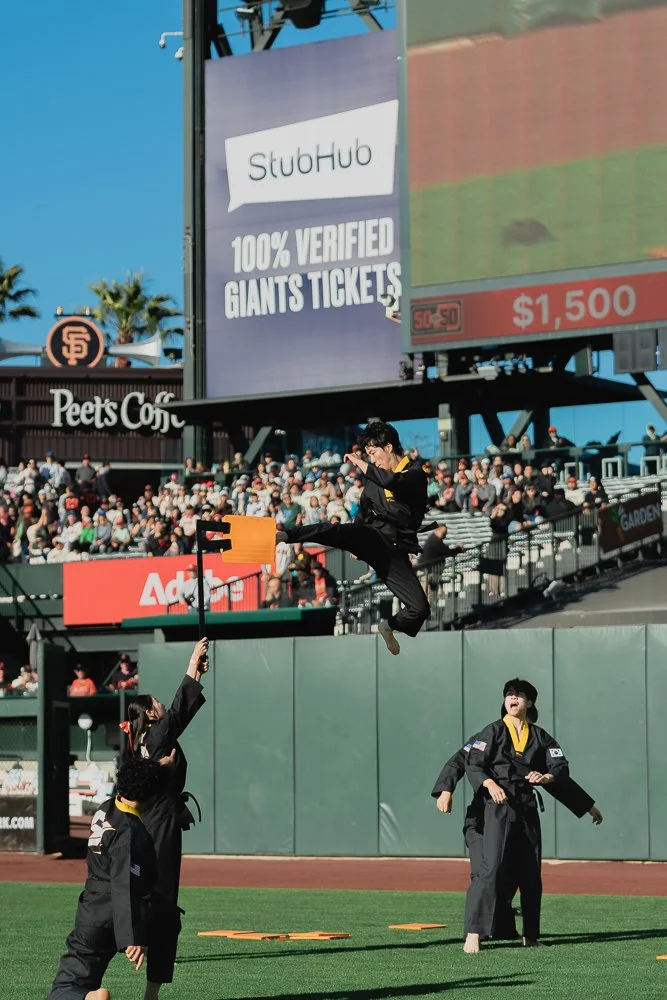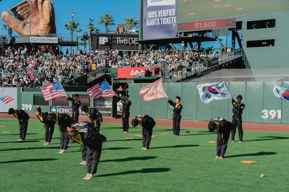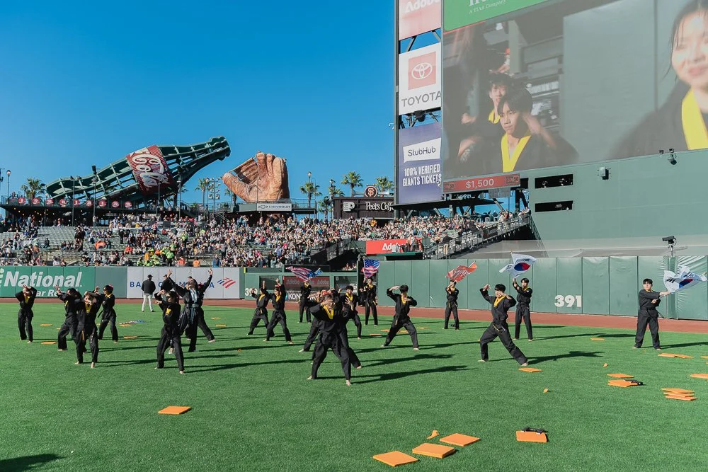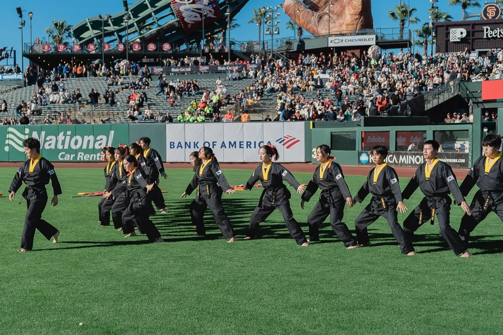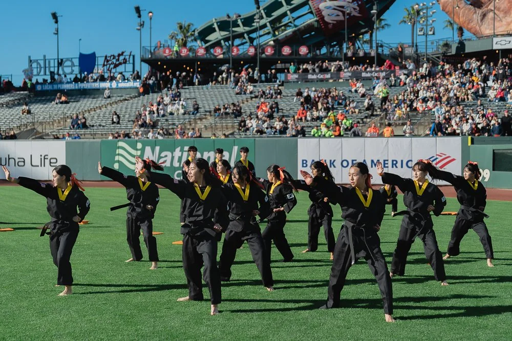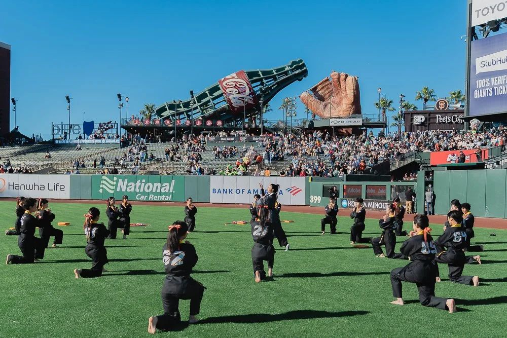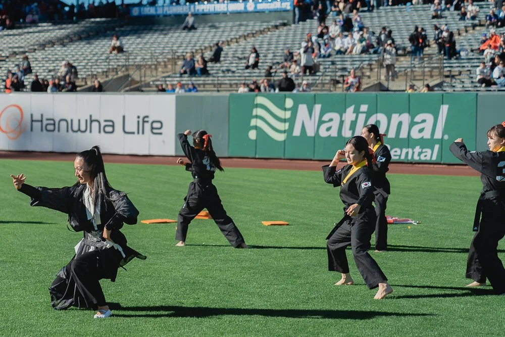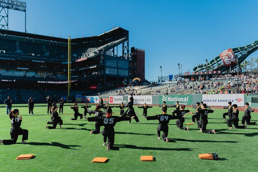 Martial arts demonstration by a group of people on a baseball field during a Korean heritage event, with a stadium and audience in the background.