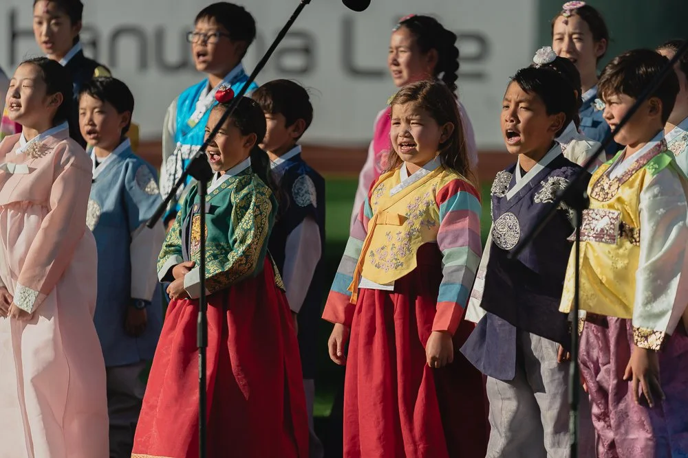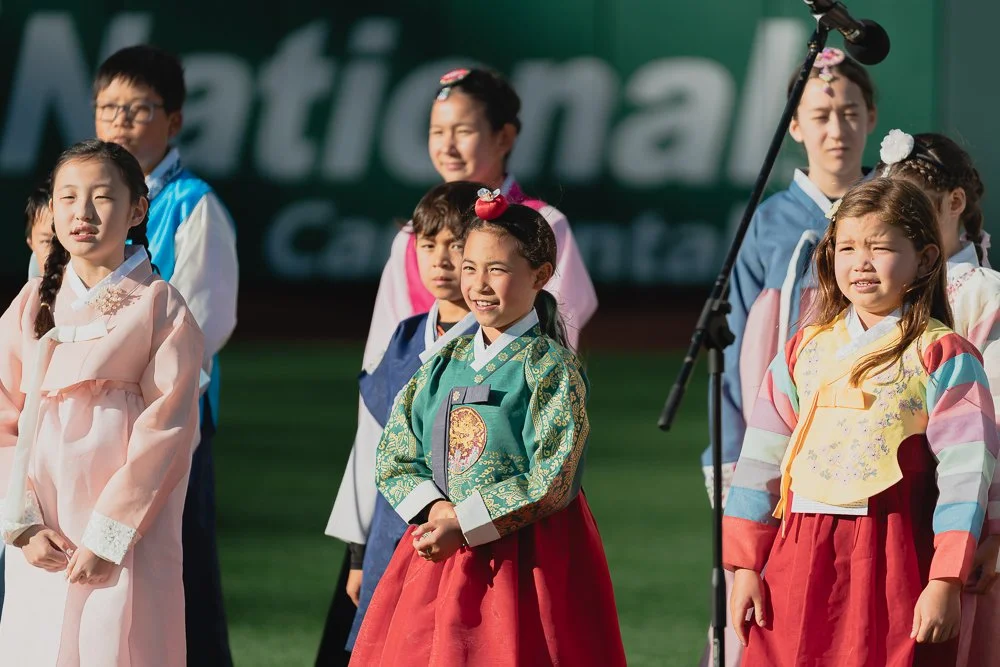 Children in traditional Korean clothing singing on a baseball field with a large crowd in the background.