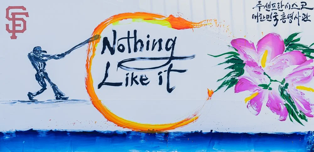 Mural with a baseball player, floral artwork, and Korean text. "Nothing Like It" text and sports logo.