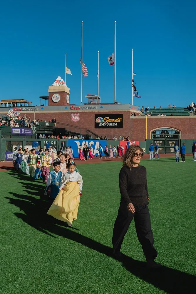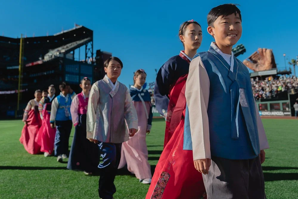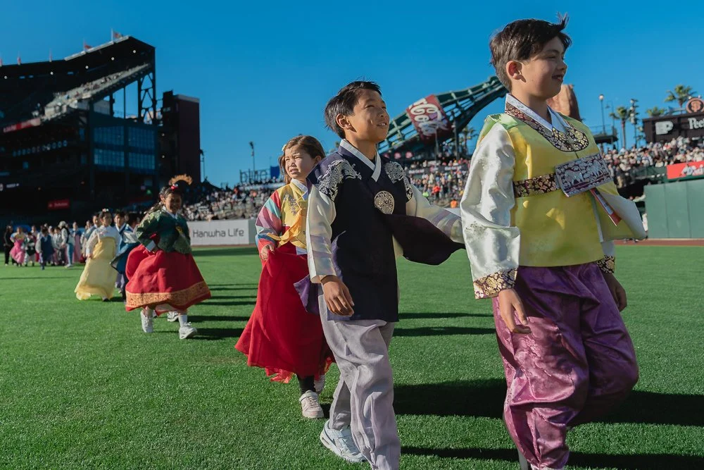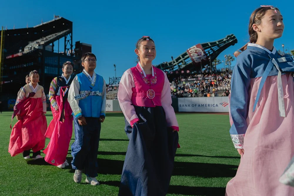 Group of children in traditional Korean clothing walking on a baseball field during a cultural event.