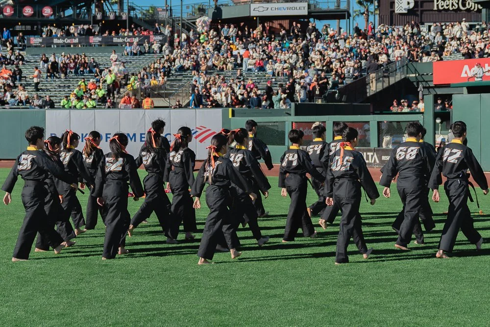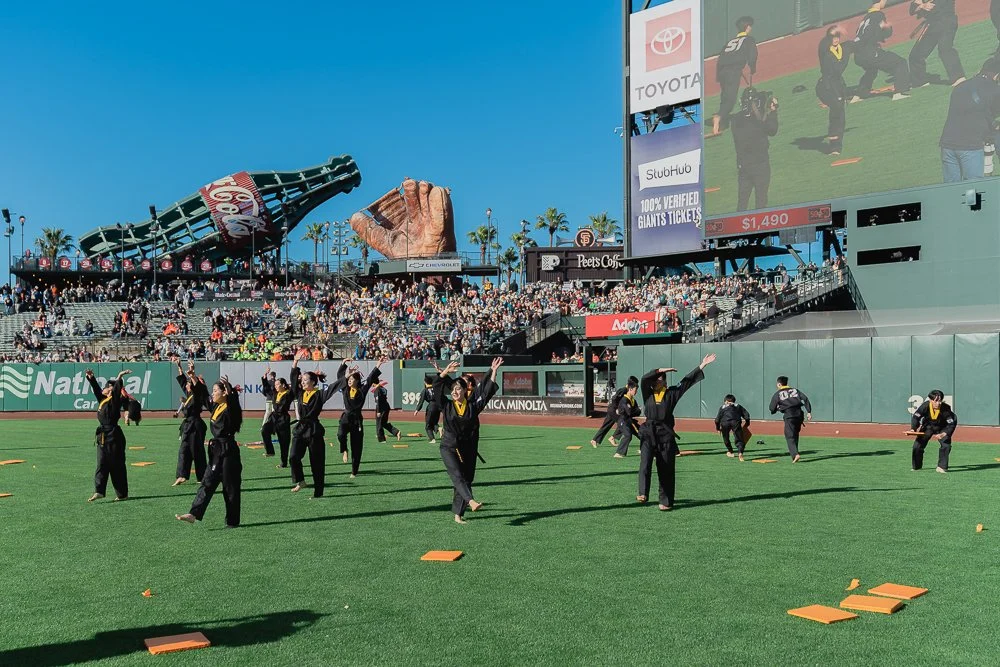 Group of martial arts performers in black uniforms lined up on a baseball field with a stadium full of spectators in the background.