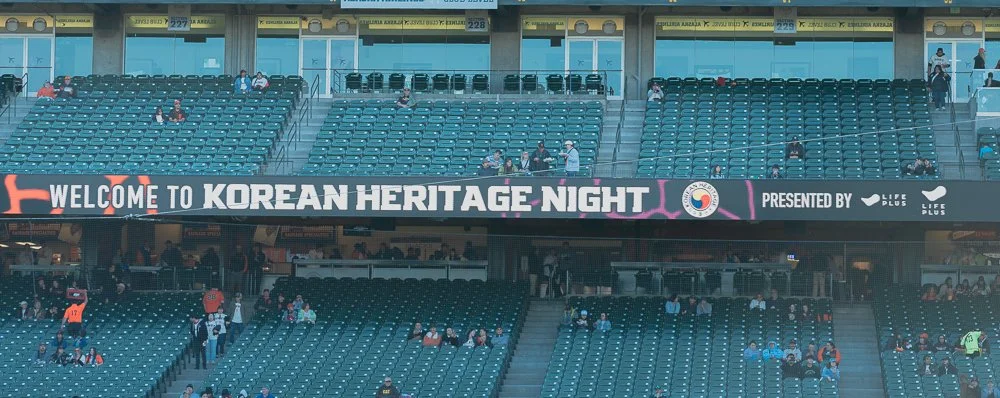 Stadium seating with a digital sign reading 'Welcome to Korean Heritage Night' presented by Life Plus.