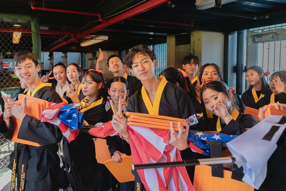 Group of martial artists in black uniforms on a sports field, carrying orange boards and flags, including Korean and American flags, during a demonstration.
