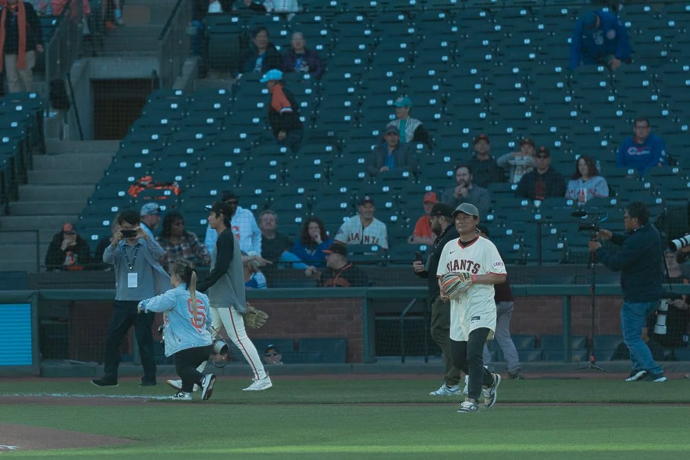 Person in baseball jersey number 51 throwing ceremonial first pitch at a baseball game, surrounded by photographers and spectators.