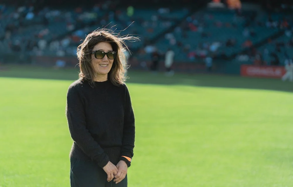 Woman wearing sunglasses standing on a sports field with spectators in the background.