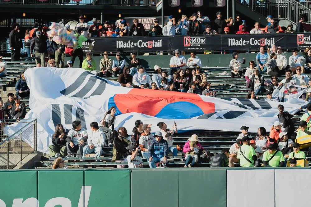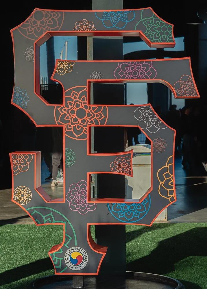 Colorful San Francisco Giants logo with floral patterns and "Korean Heritage" emblem