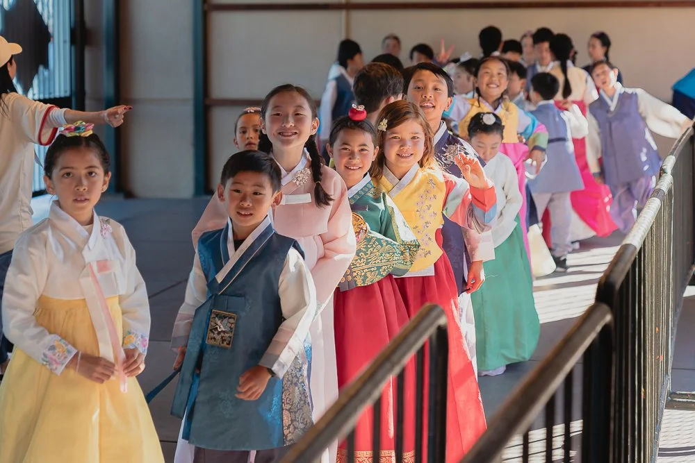 Group of children wearing traditional Korean clothing, hanboks, smiling and posing for a photo.