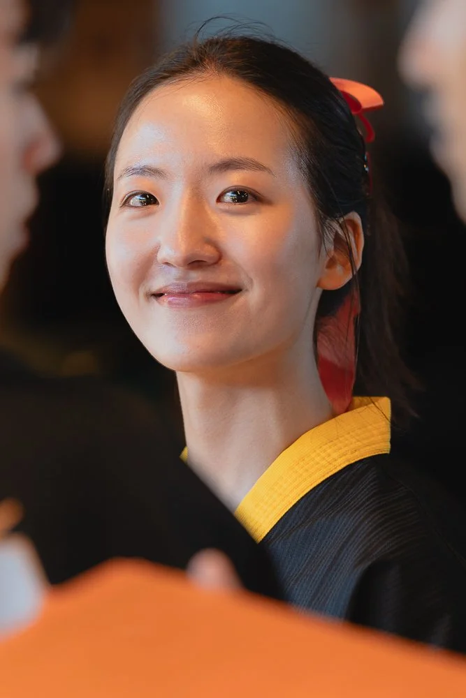 Two people in martial arts uniforms with Korean flag patch talking indoors.