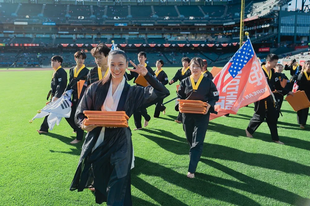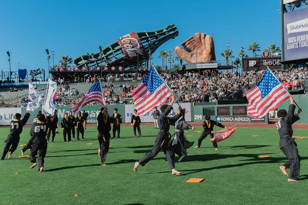 Martial arts performers holding flags of the United States and South Korea on a baseball field, with a sports stadium backdrop.