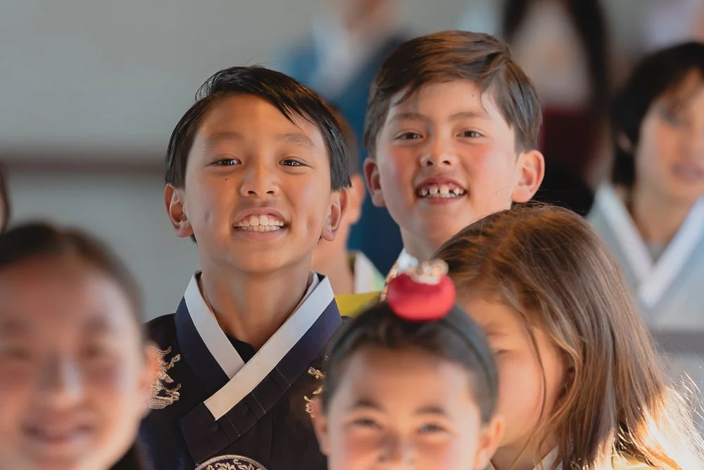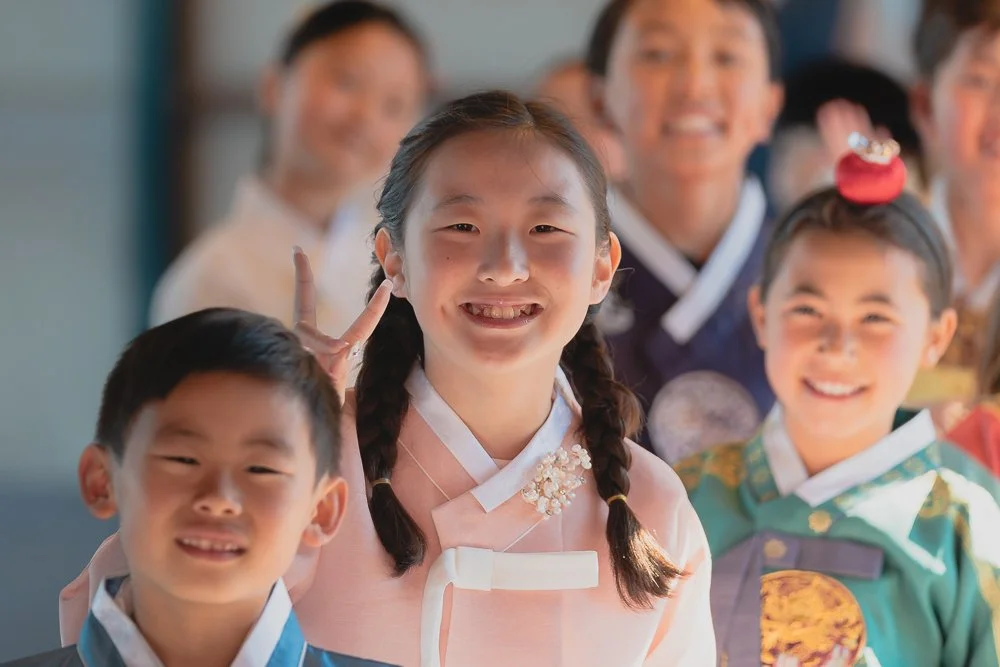 Group of children smiling and wearing traditional Korean hanbok clothing.