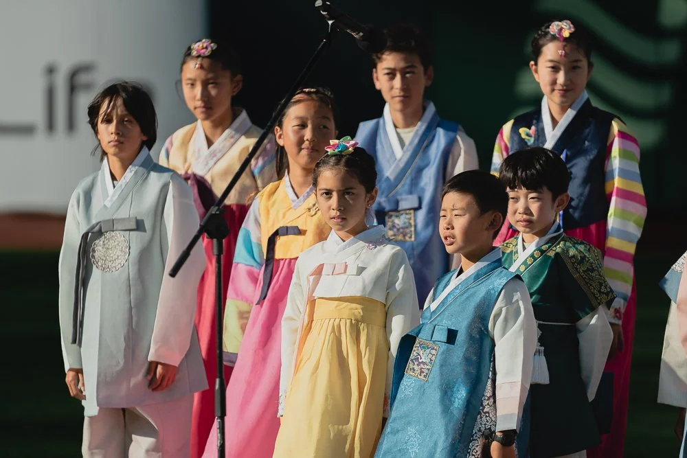 Group of children wearing traditional Korean hanbok outfits, standing on a field, performing in front of a microphone.