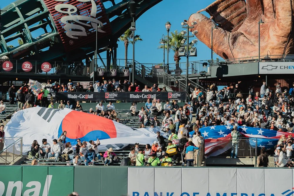 Crowd at a baseball stadium with large flags, including South Korean and American flags, a giant Coca-Cola bottle, and oversized baseball glove in the background.