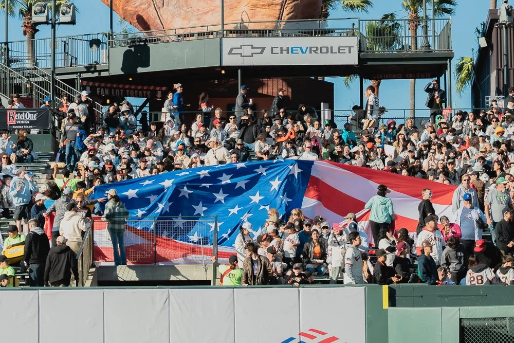 Crowd at a stadium holding a large American flag, with Chevrolet logo overhead.