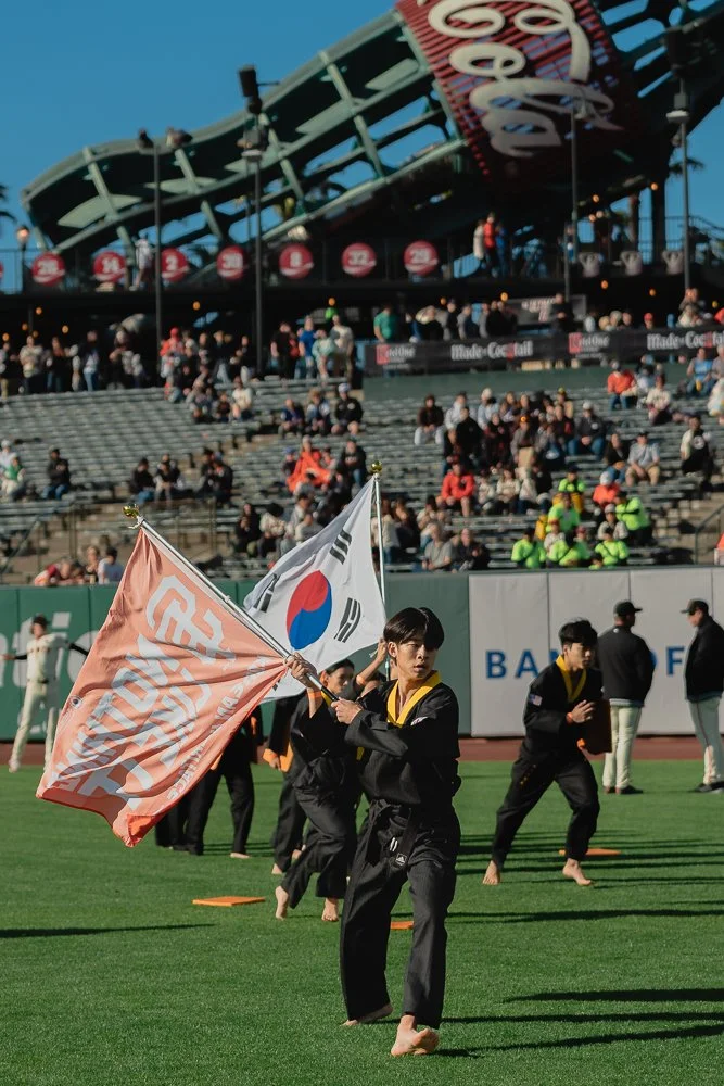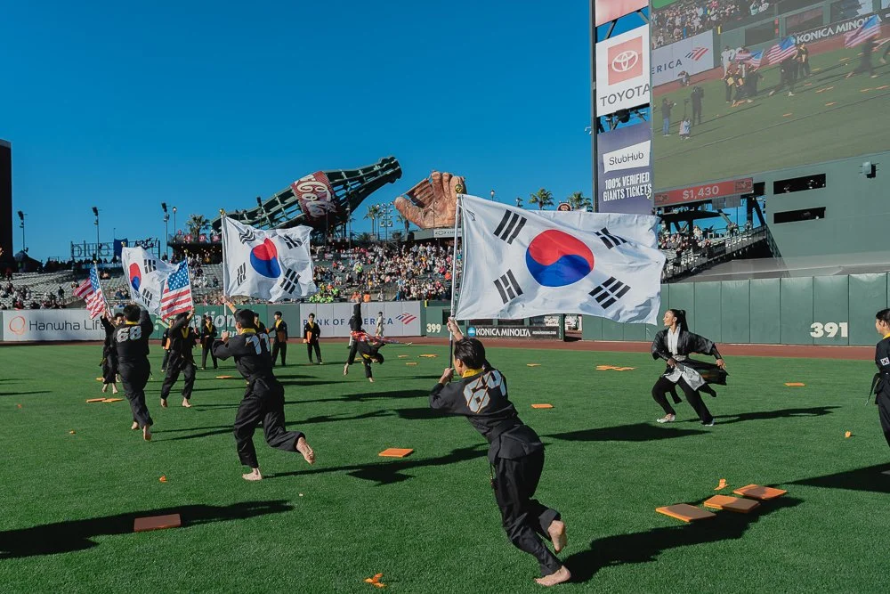 Martial artists performing on a baseball field, waving South Korean and American flags, with a crowd in the background.