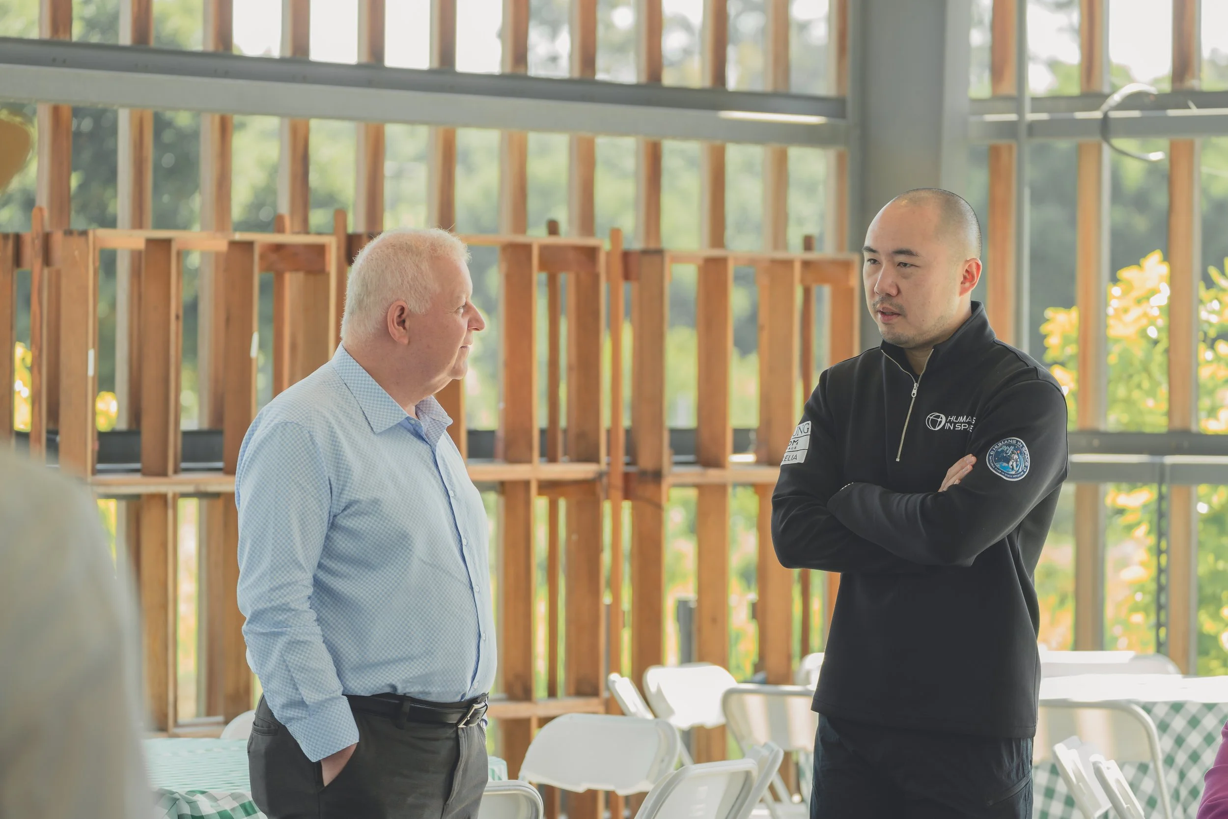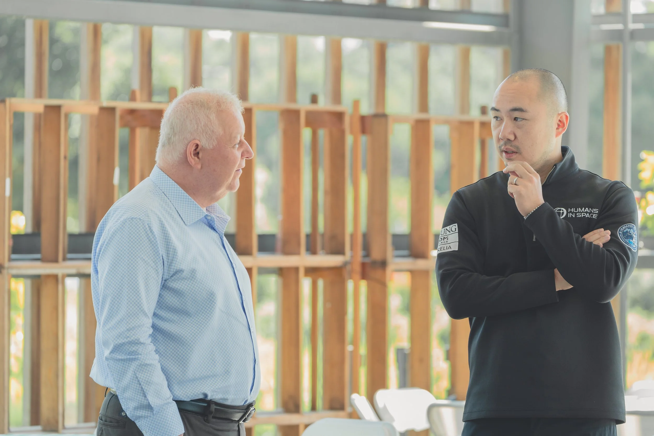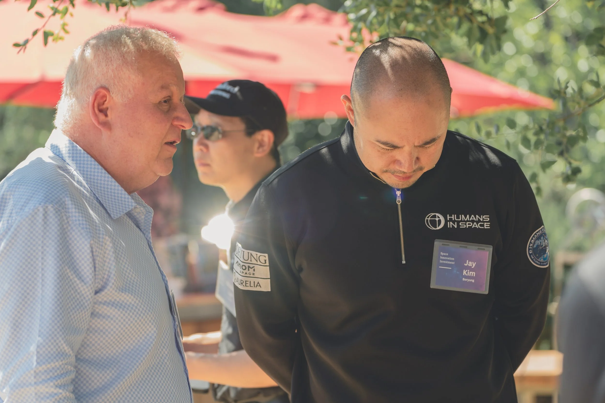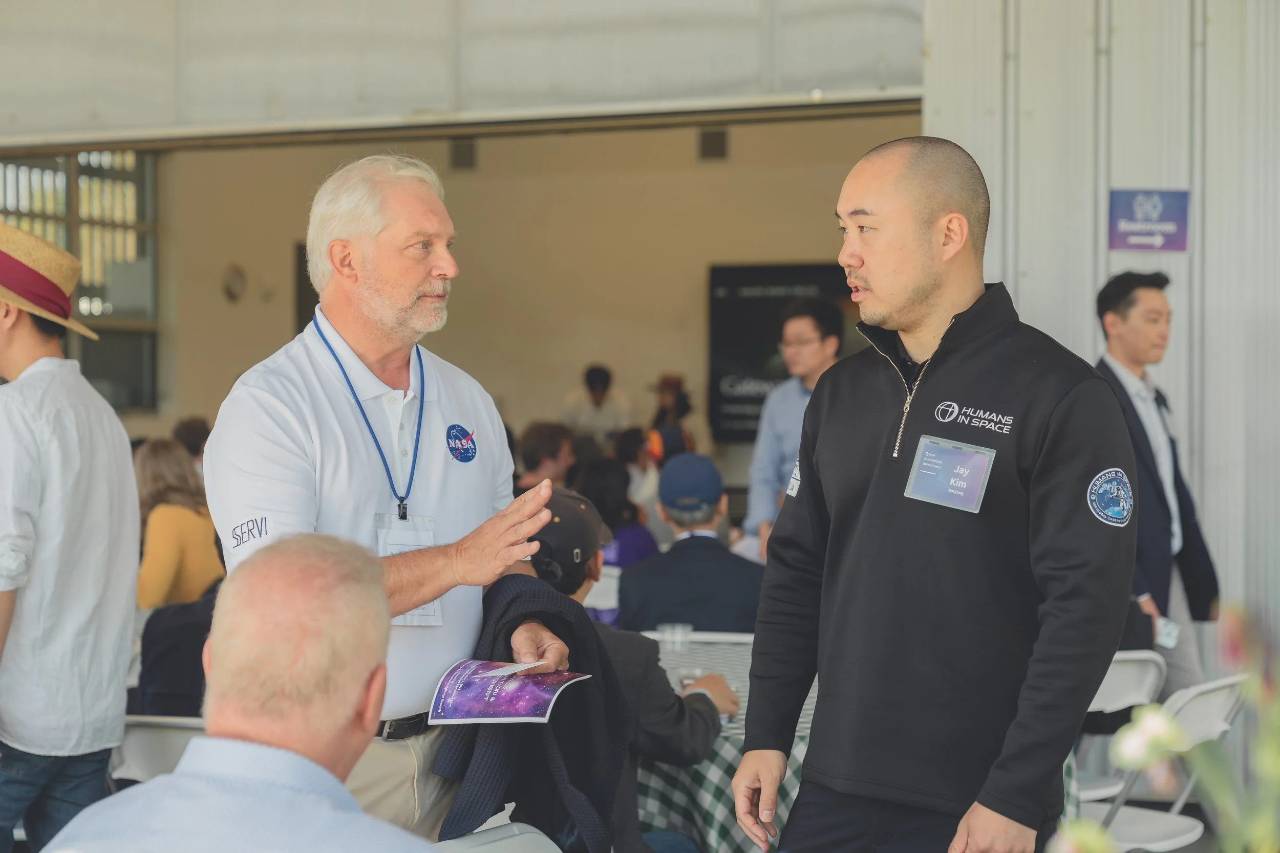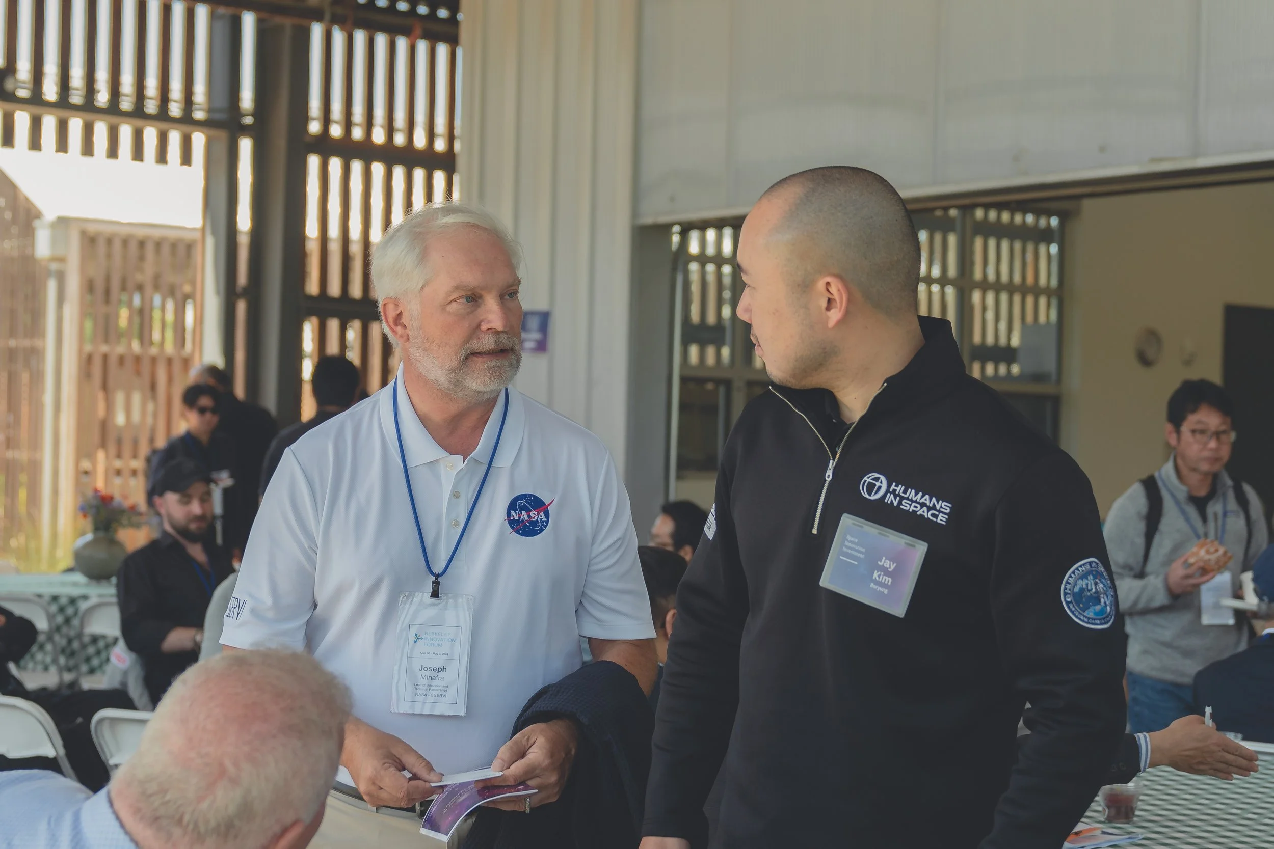 Two men having a conversation, one in a blue shirt, the other in a "Humans in Space" jacket.