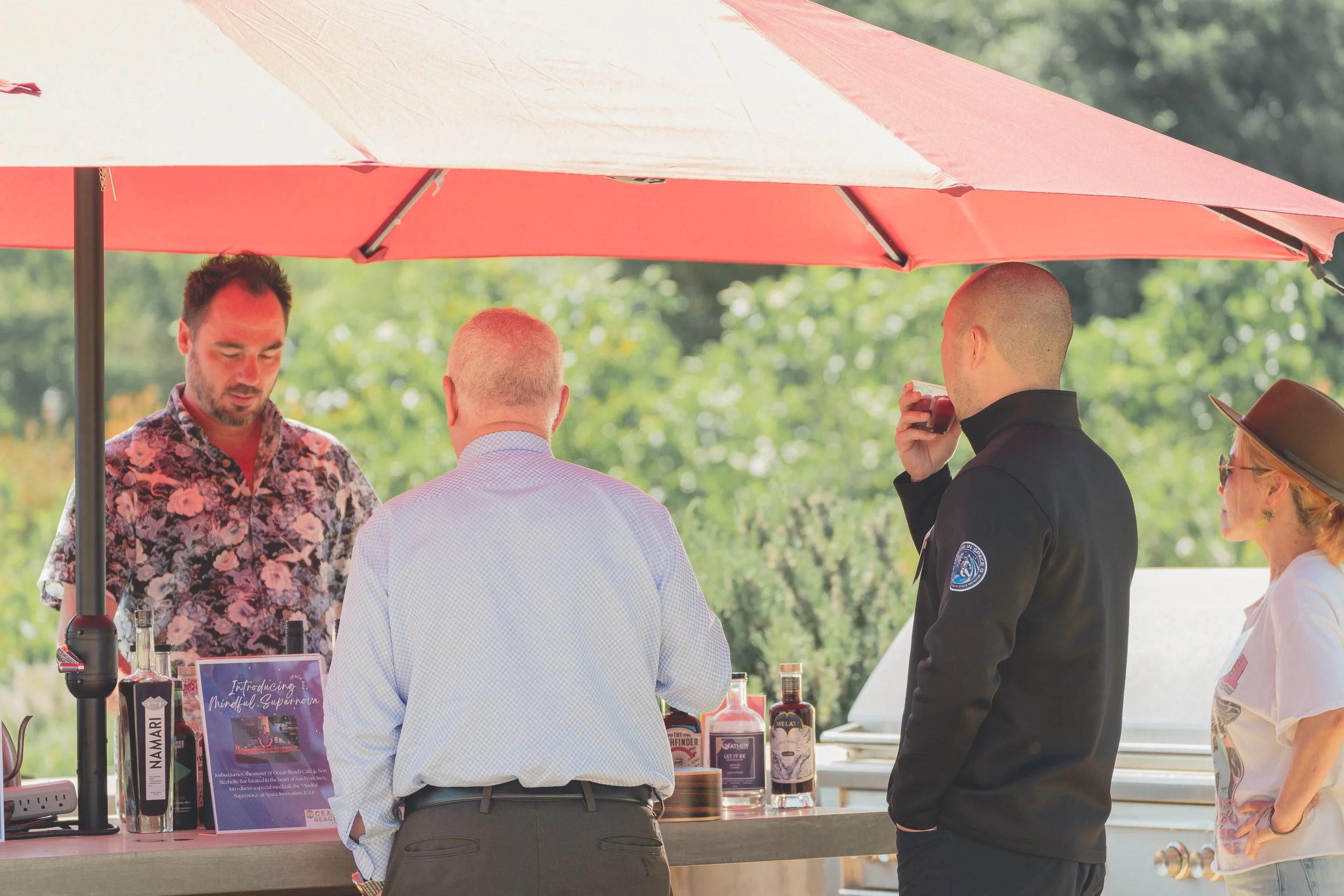 People standing at an outdoor bar under a red umbrella, with one person serving drinks. Bottles and a sign are on the counter.