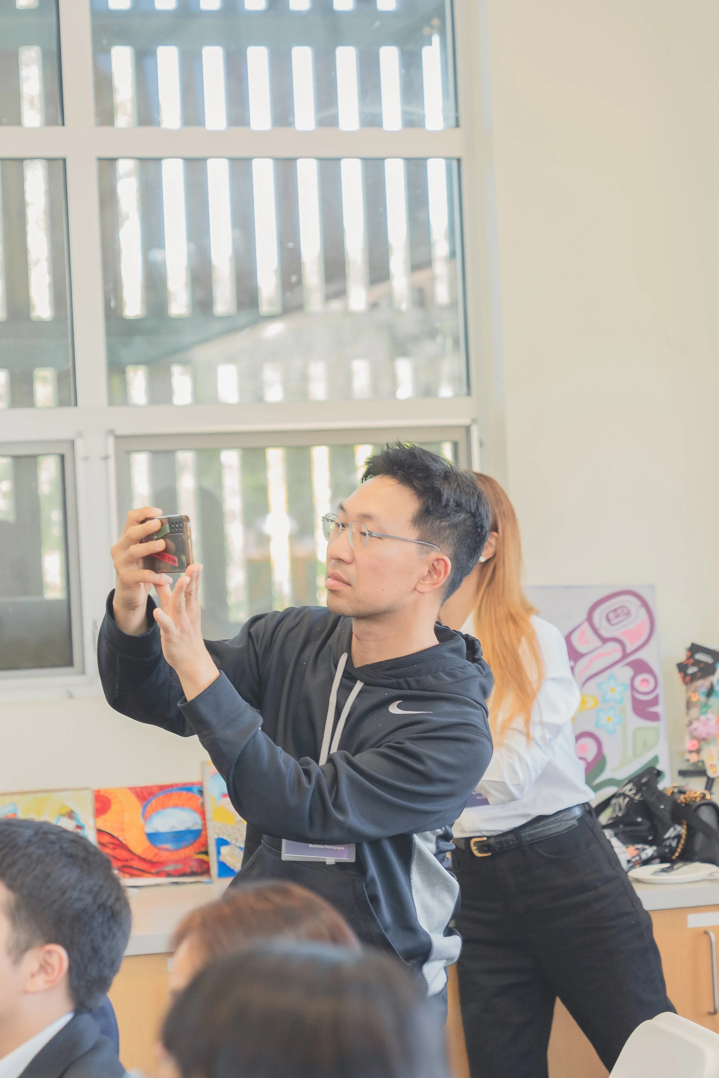 Person taking a photo or video with a smartphone in an indoor setting, with artwork displayed in the background.