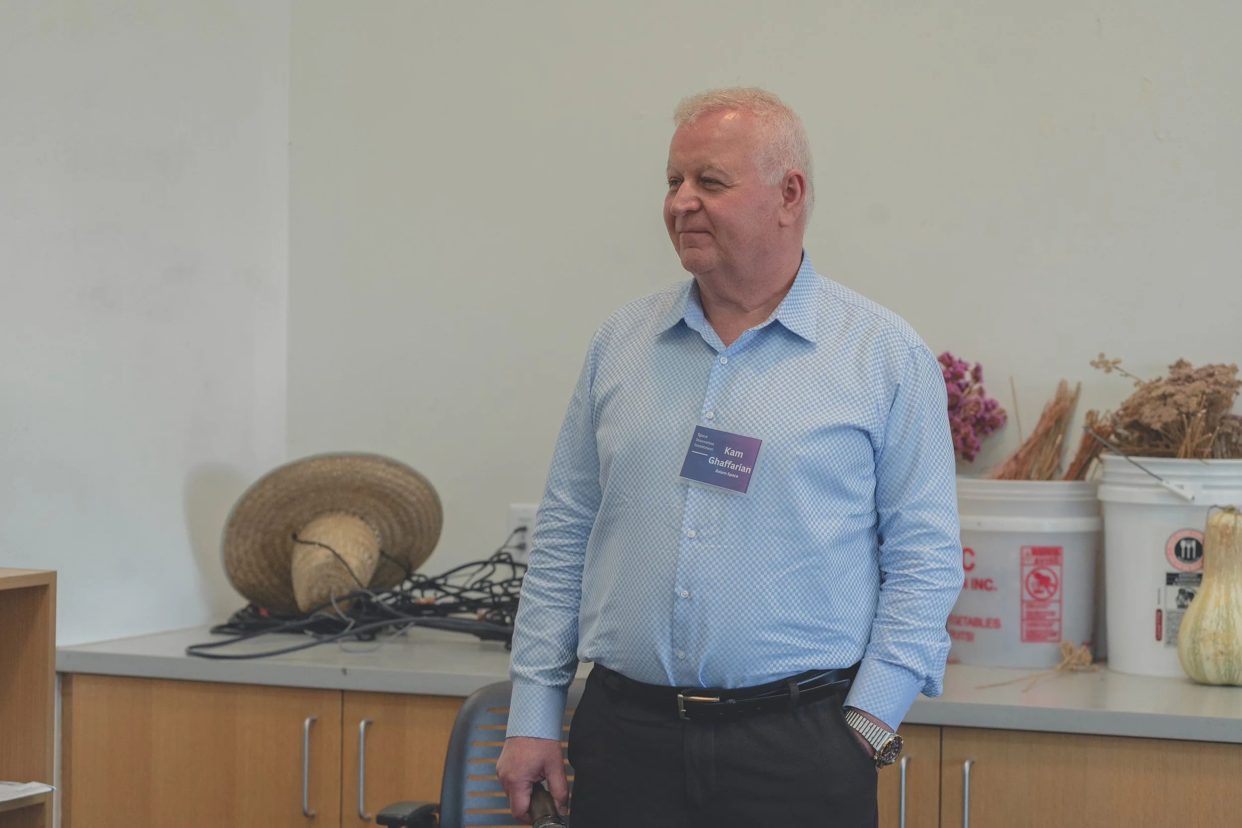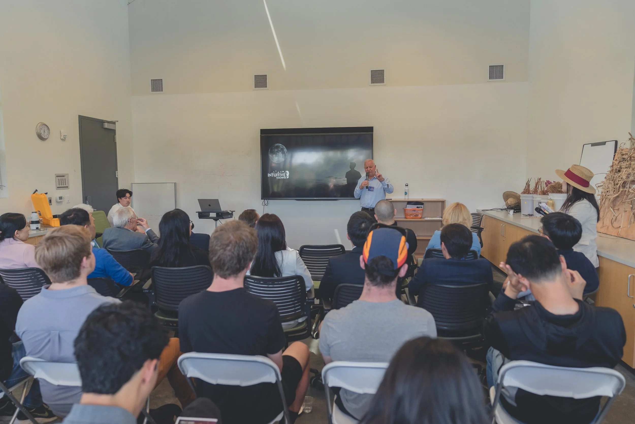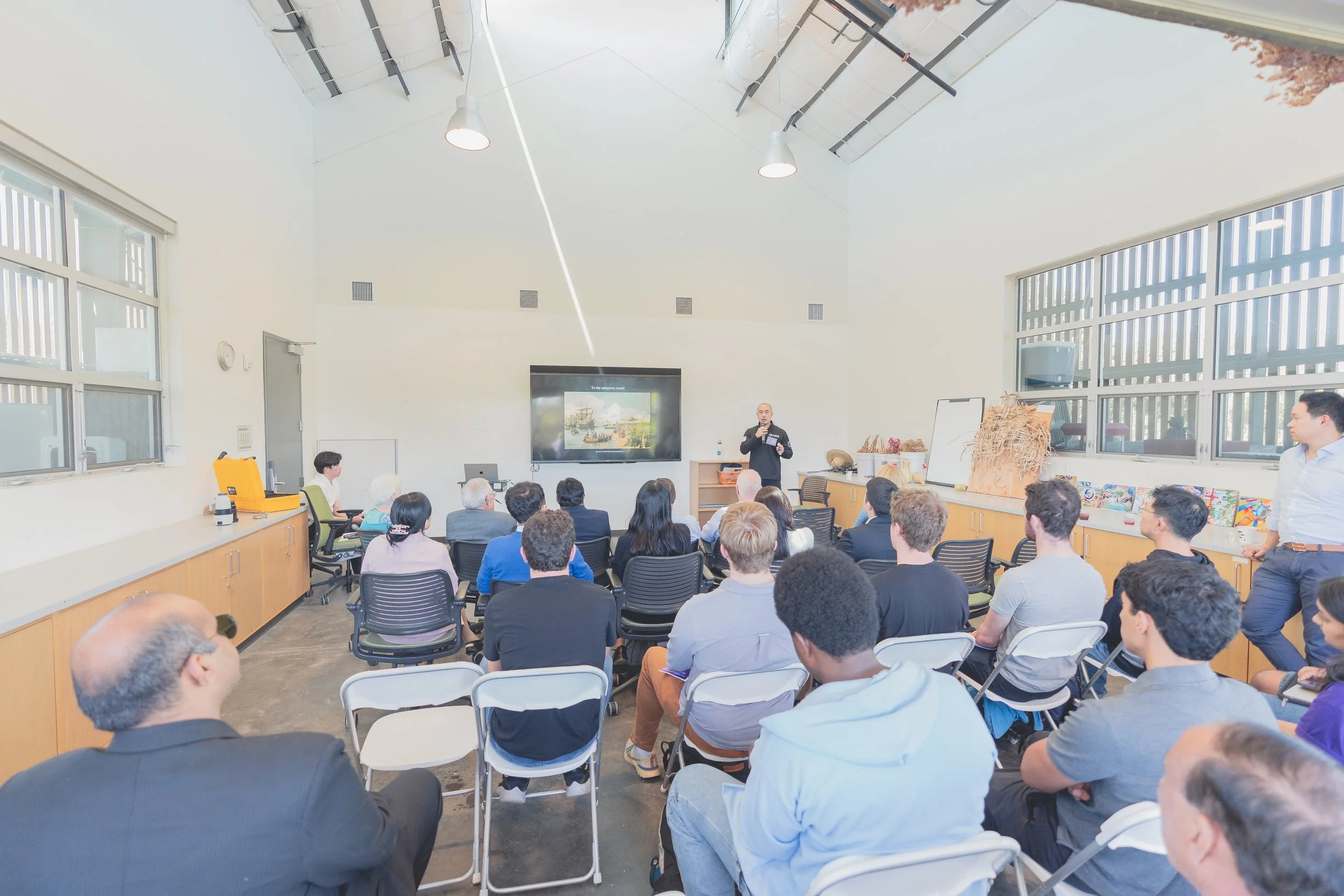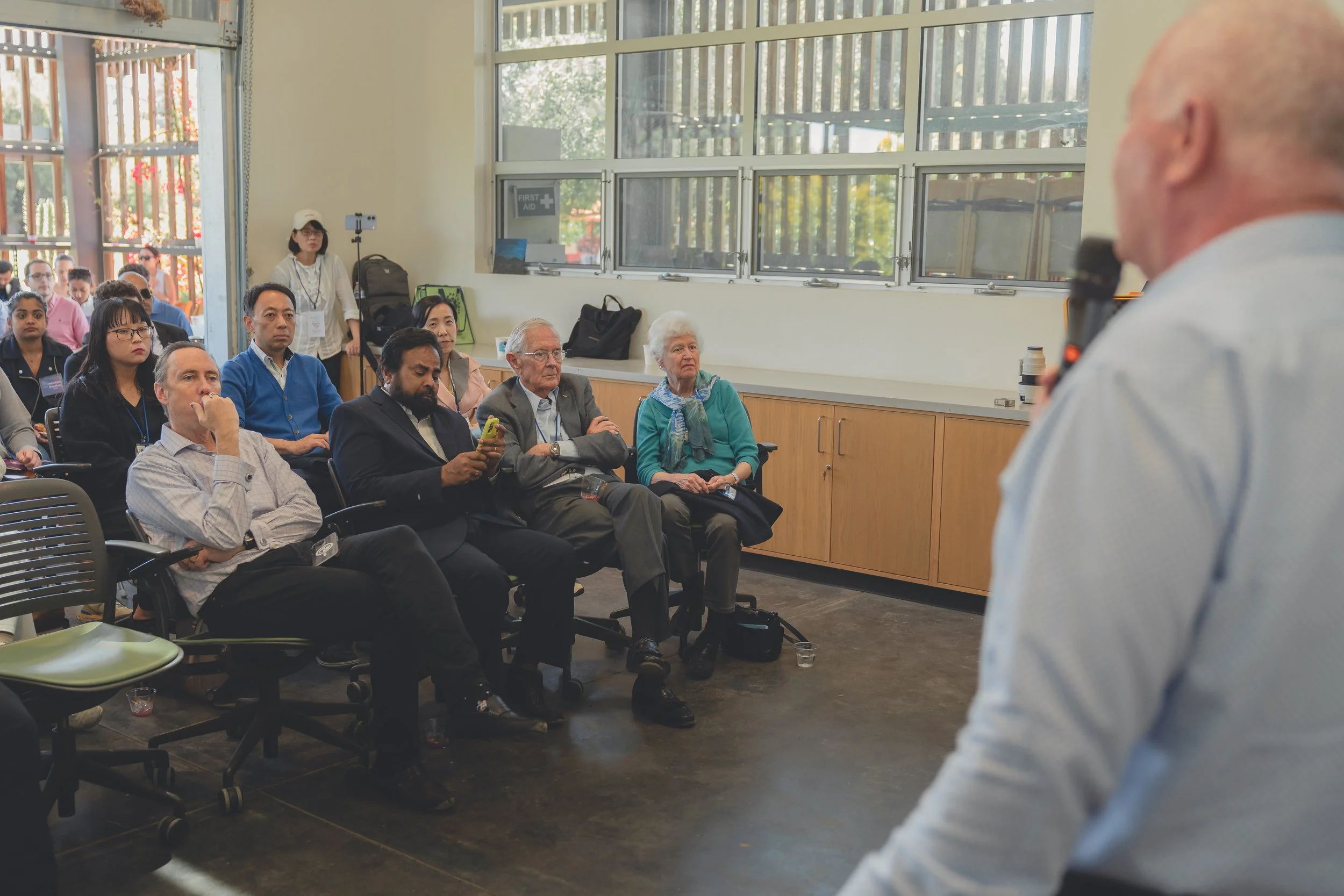 A group of people attending a lecture or presentation in a well-lit classroom. The speaker is presenting in front of a screen with an image displayed. Attendees are seated on chairs, facing the speaker.