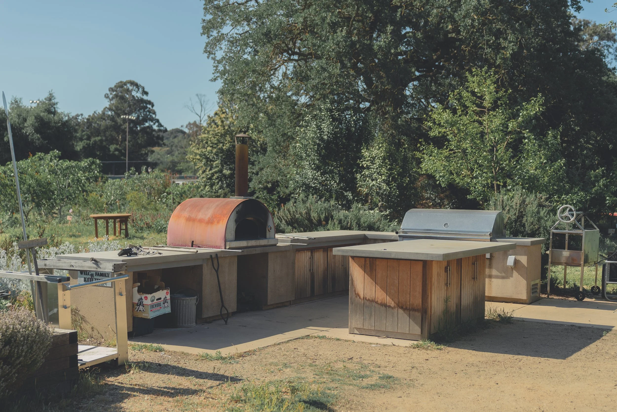 Outdoor kitchen with pizza oven and grill, surrounded by trees and greenery.
