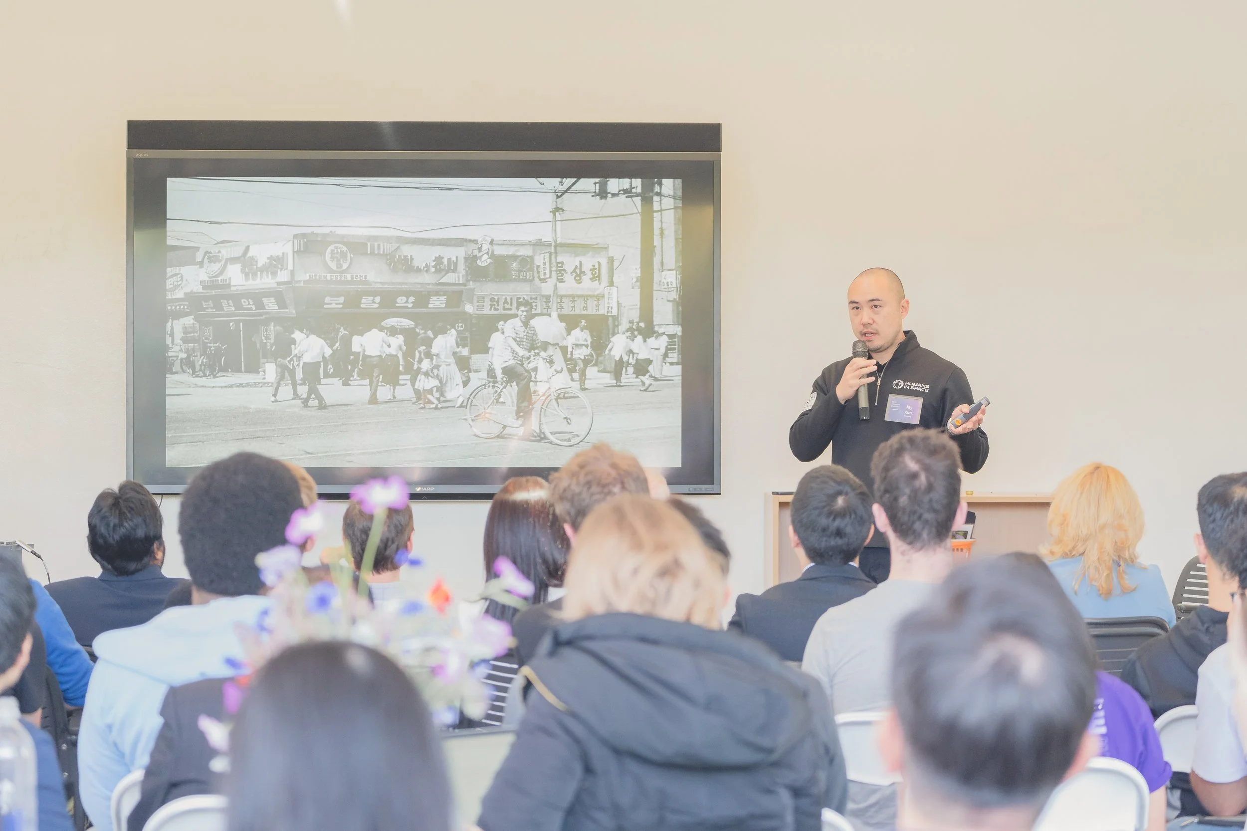 Person giving a presentation to an audience with a projected black-and-white image of a busy street scene.