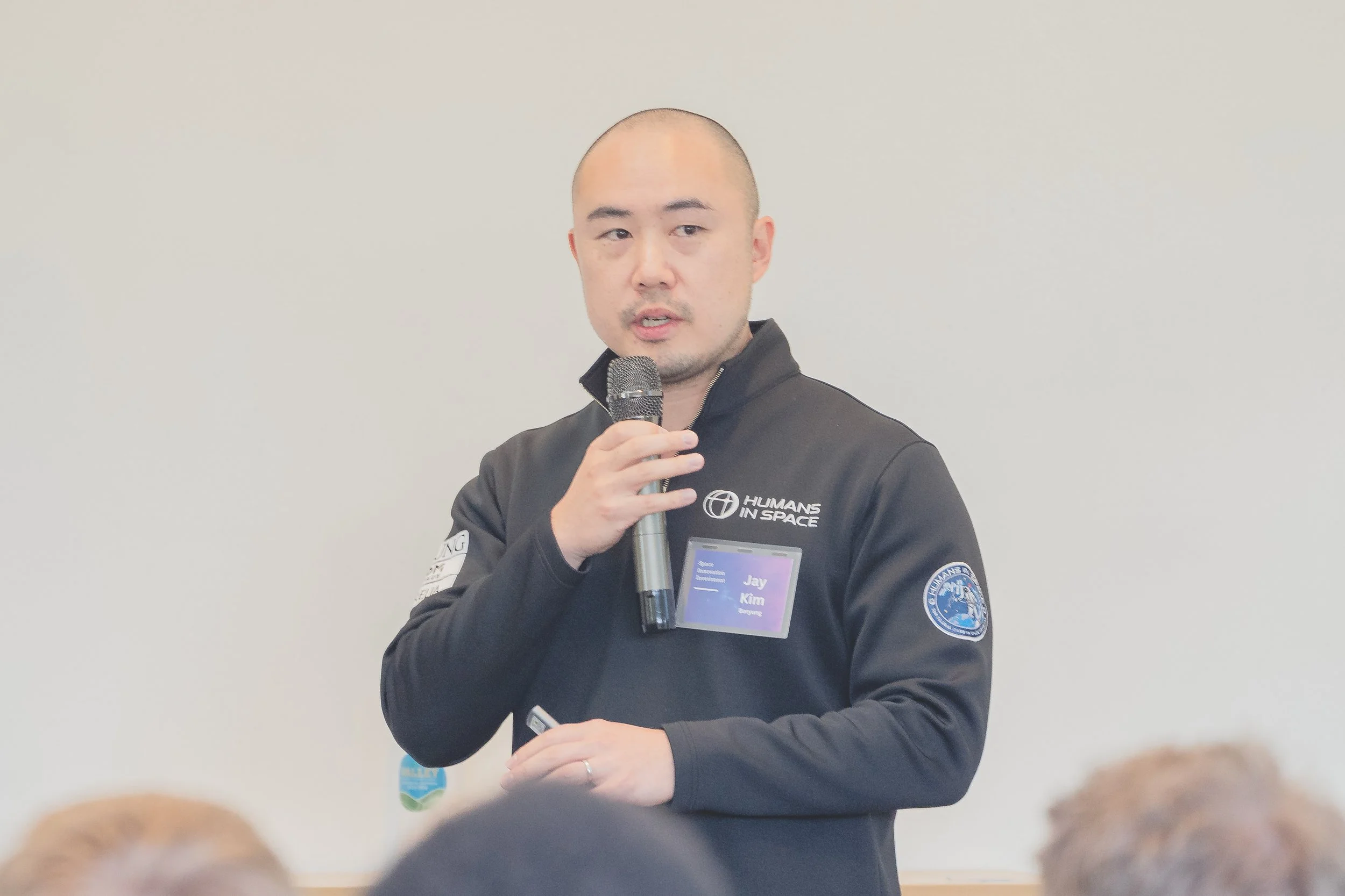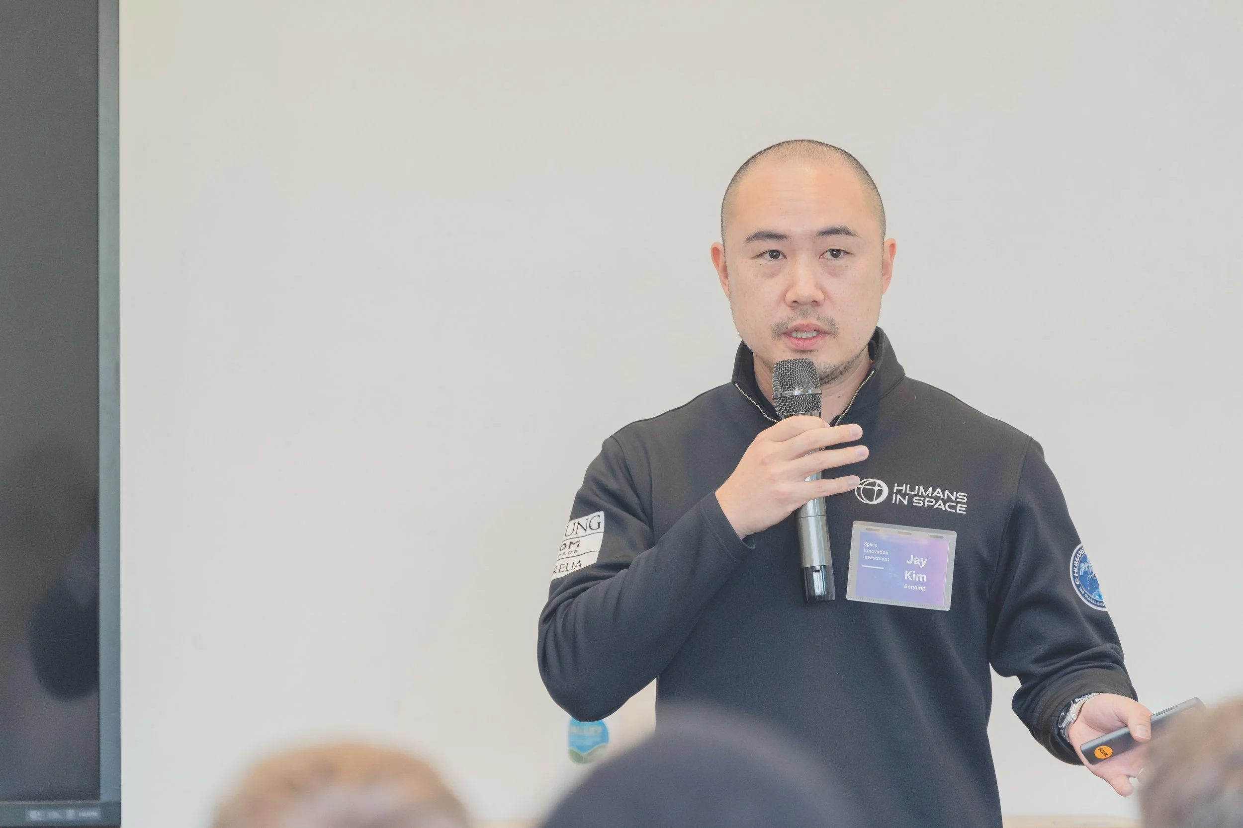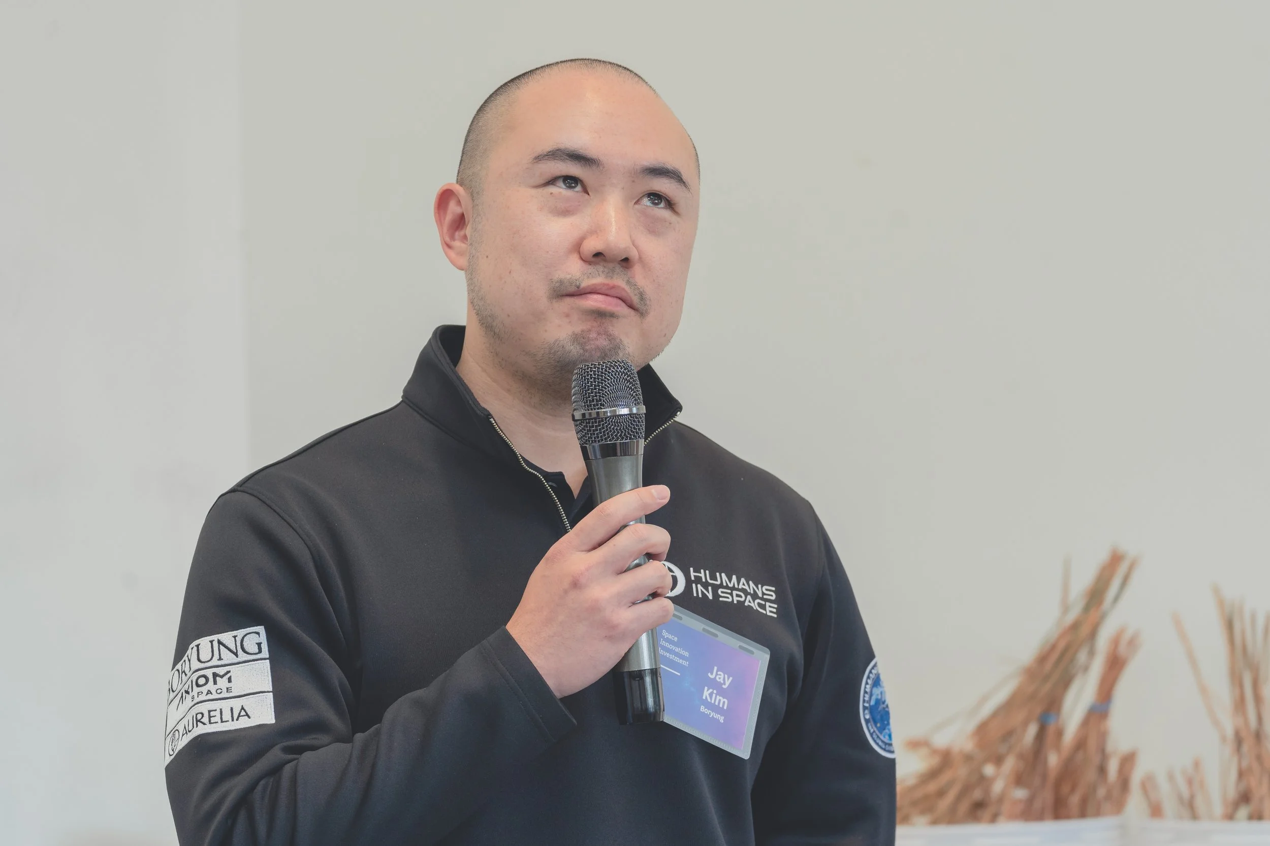 A person holding a microphone and speaking, wearing a black jacket with "Humans in Space" text and a name tag labeled "Jay Kim."