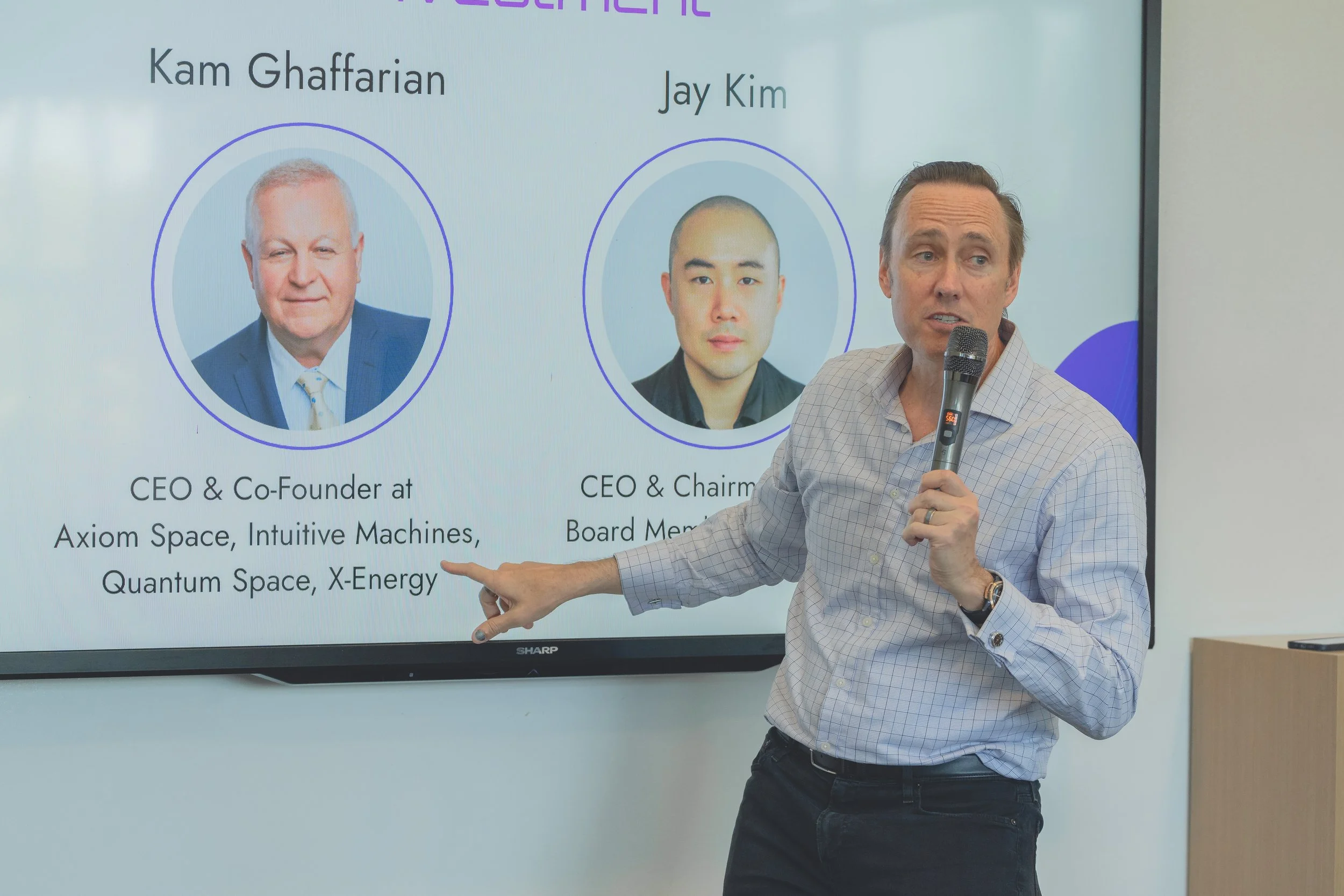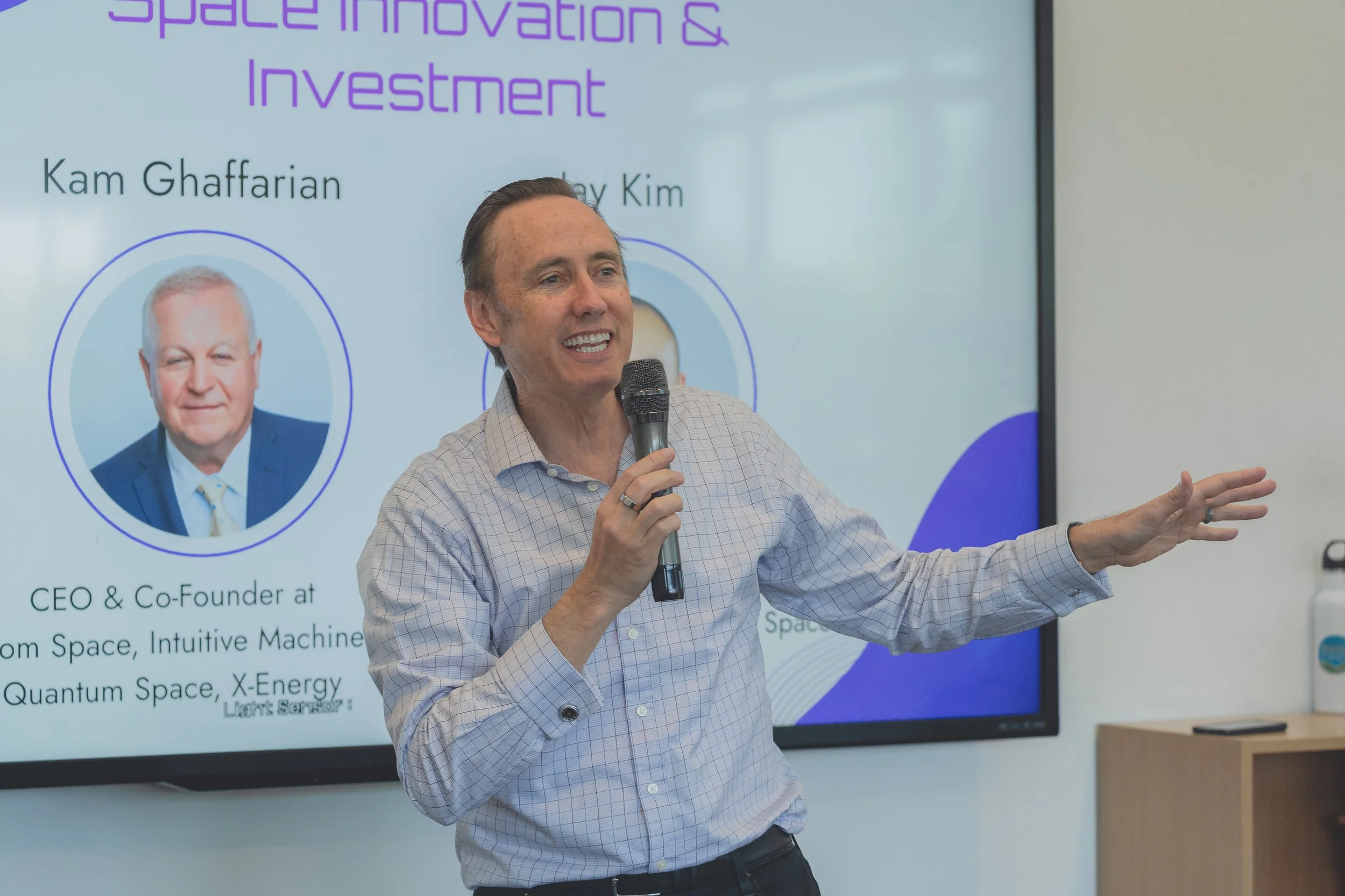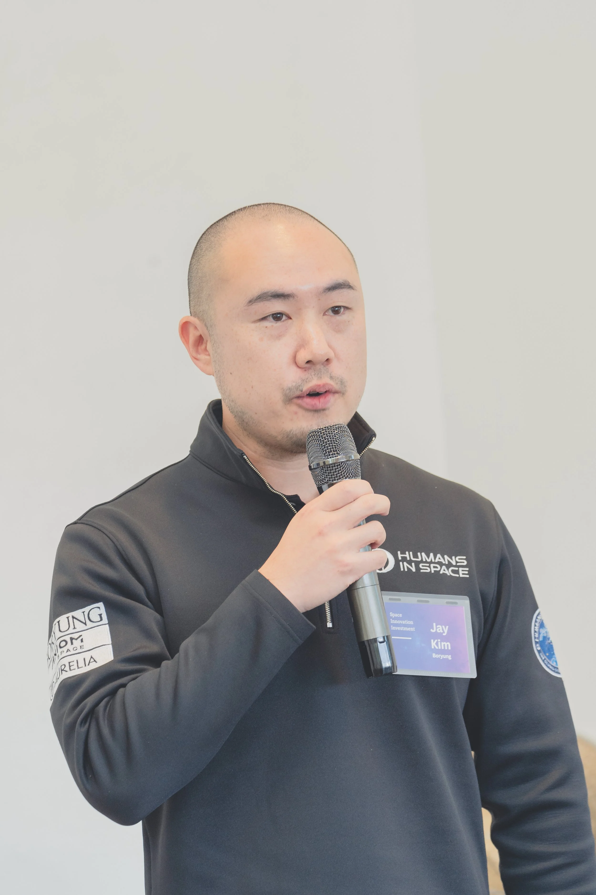 A person holding a microphone and speaking, wearing a black jacket with "Humans in Space" text and a name tag labeled "Jay Kim."