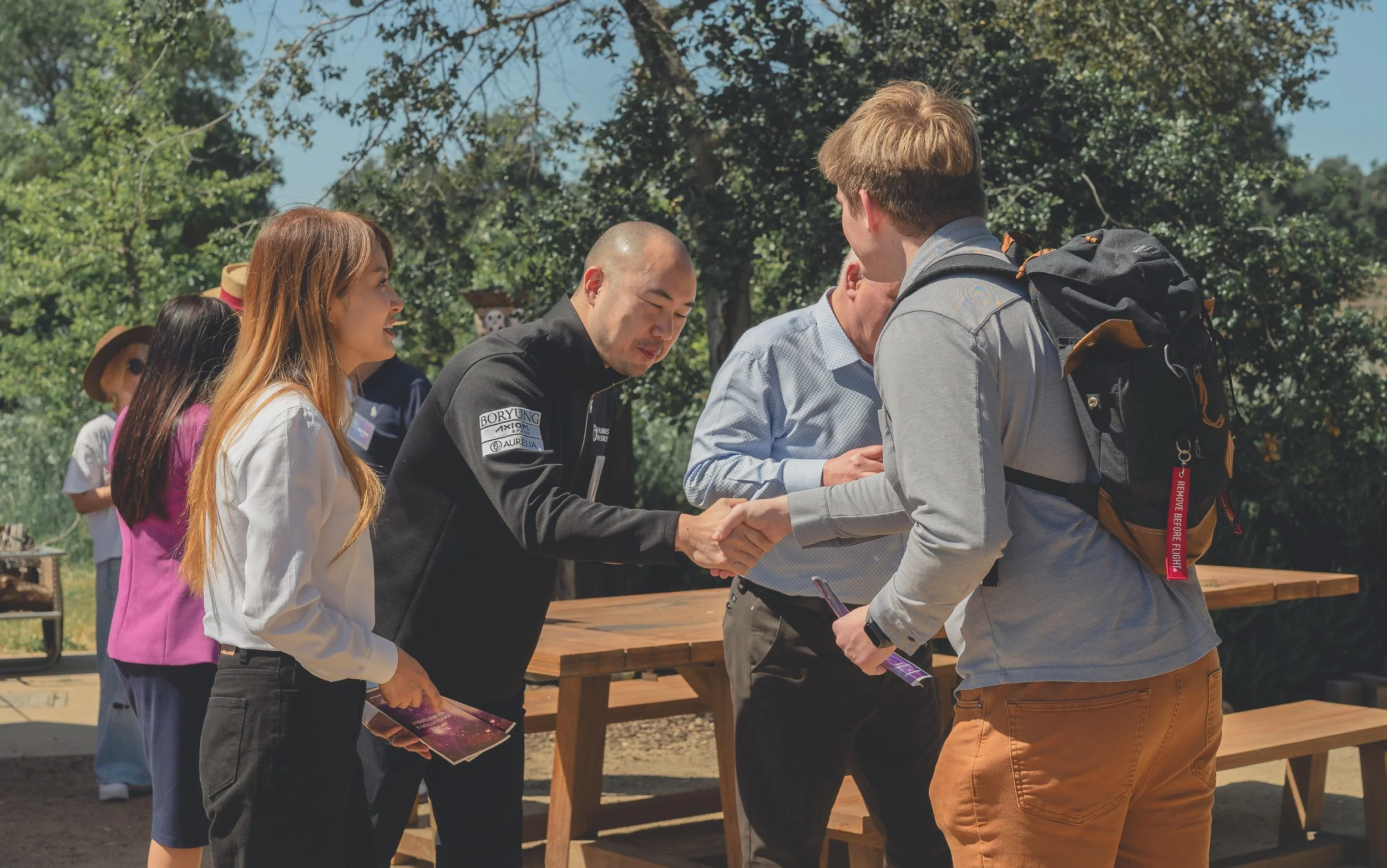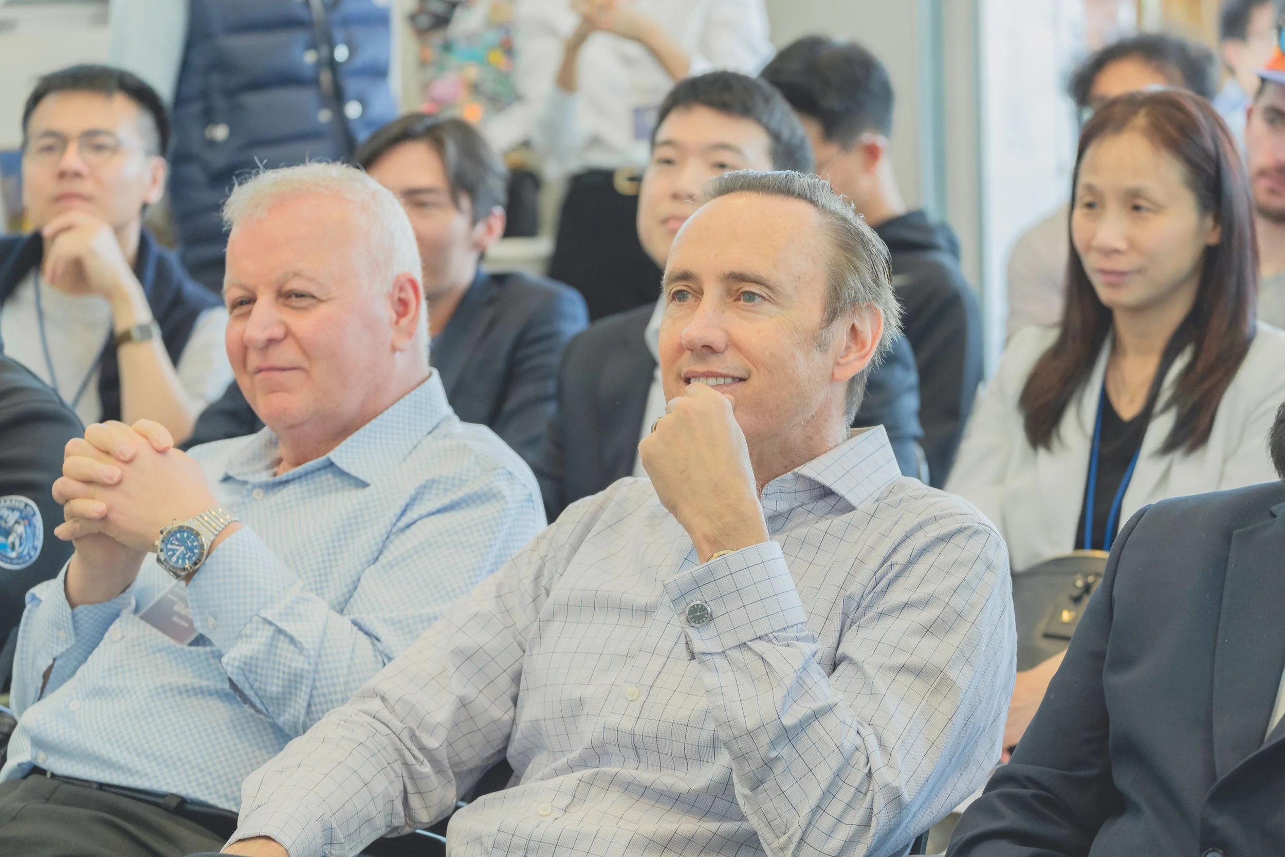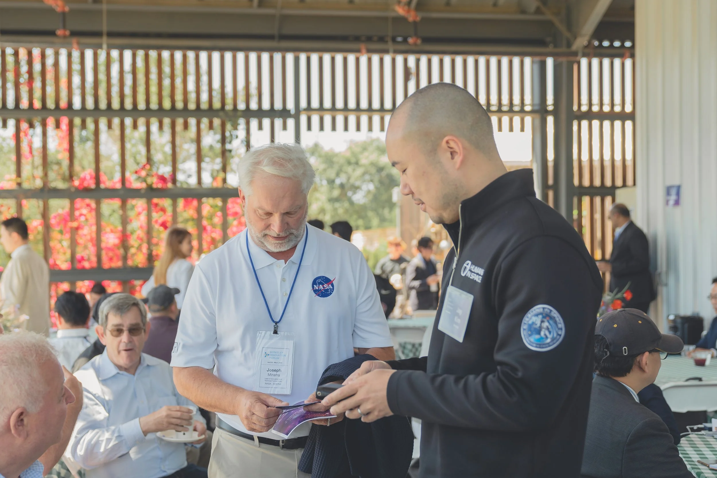Two men exchanging business cards, one wearing a black 'Humans in Space' jacket, in a professional setting with a presentation screen in the background.