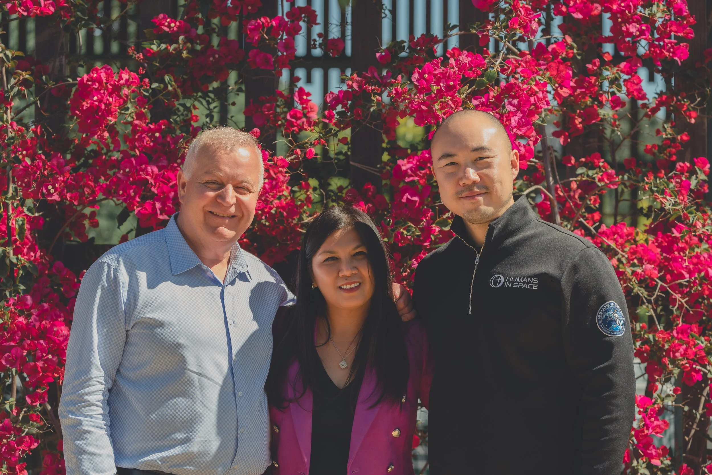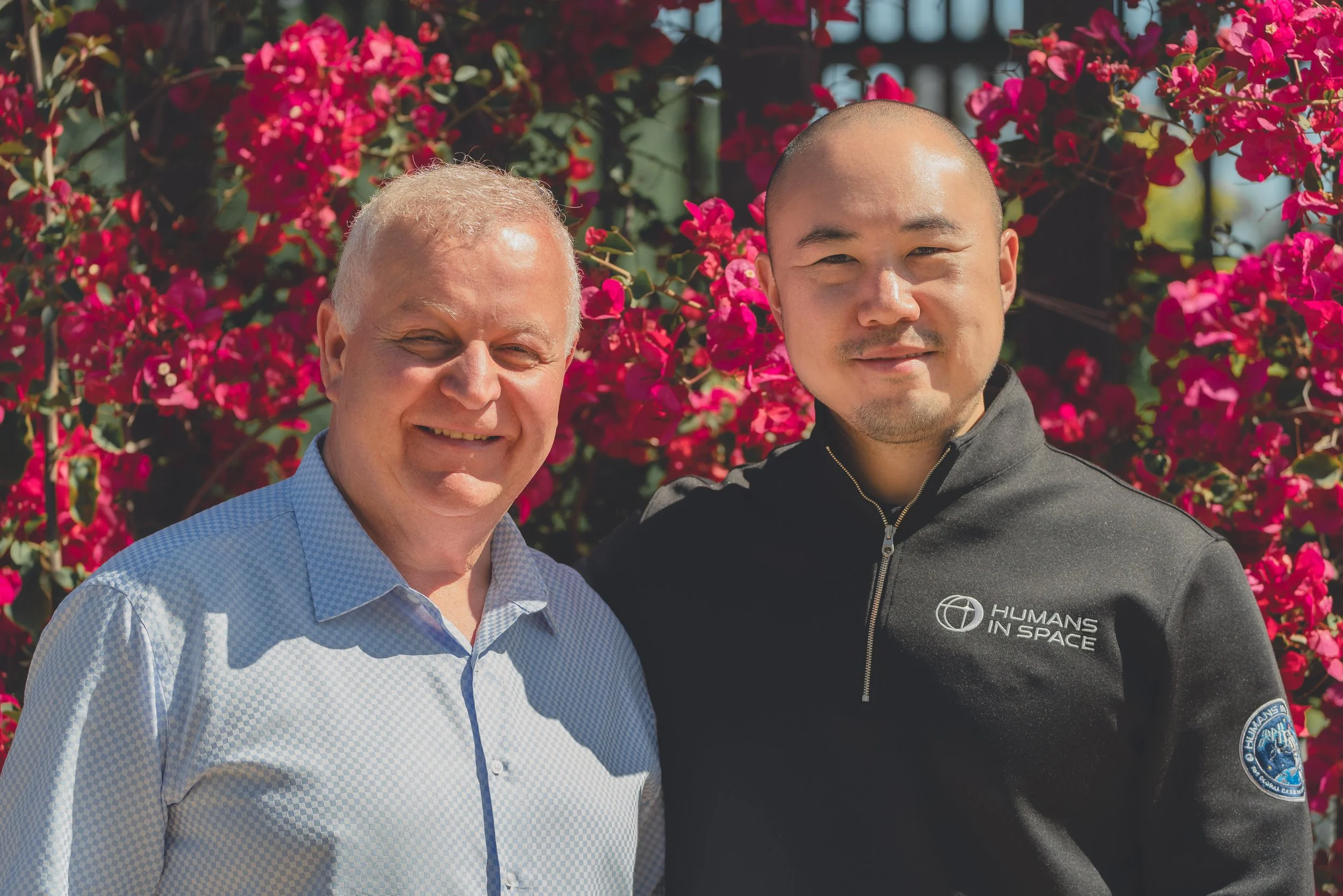 Two men smiling in front of vibrant pink flowers, one wearing a light blue shirt and the other a black "Humans in Space" jacket.