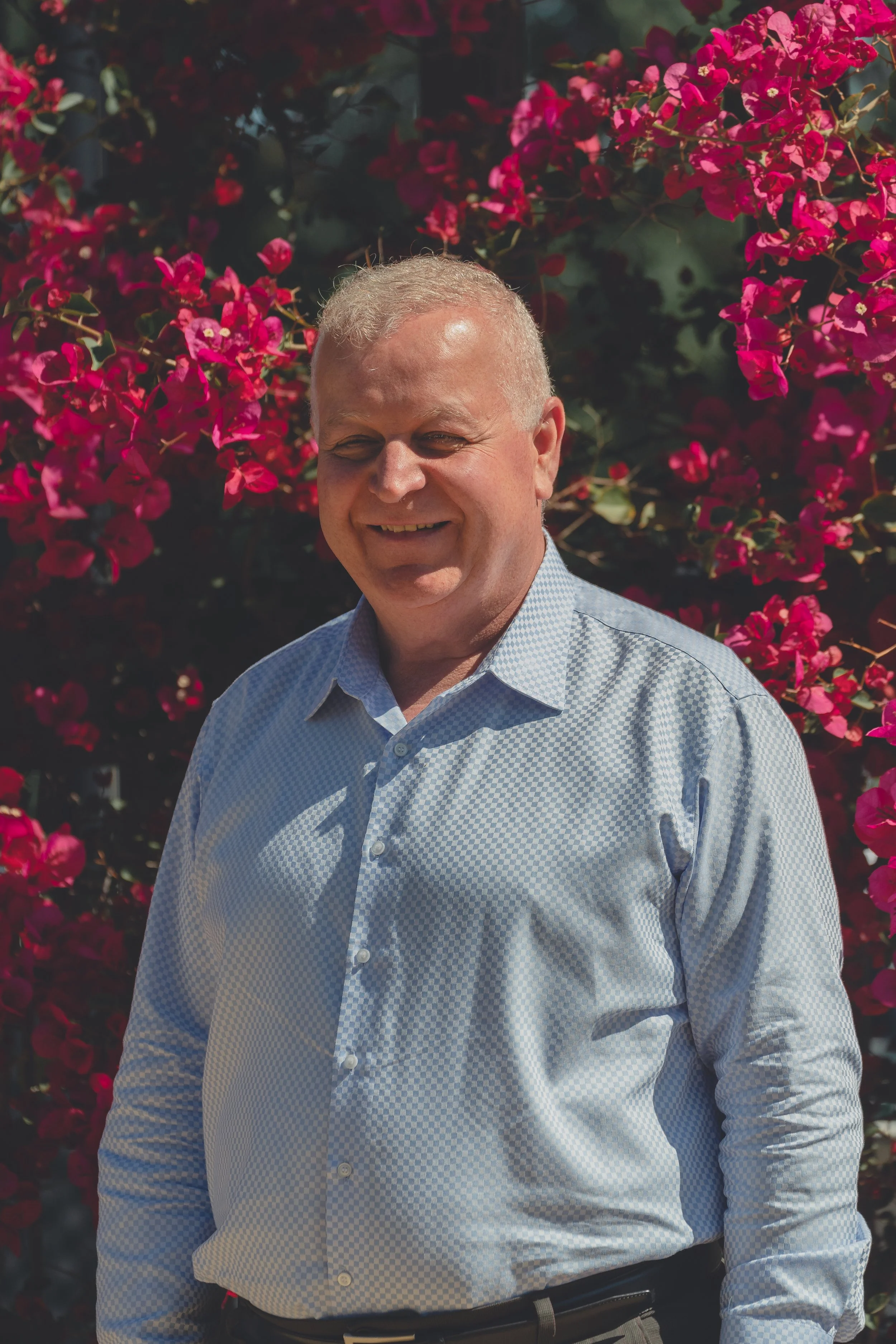 Smiling man in a light blue shirt standing in front of vibrant pink flowers.