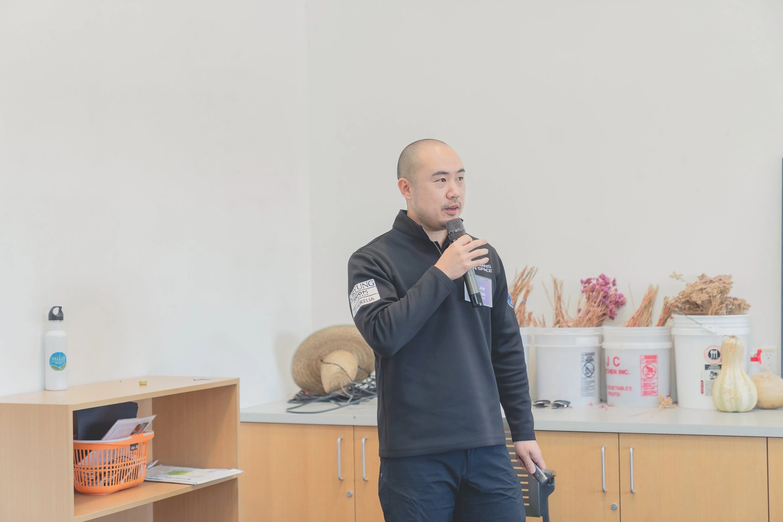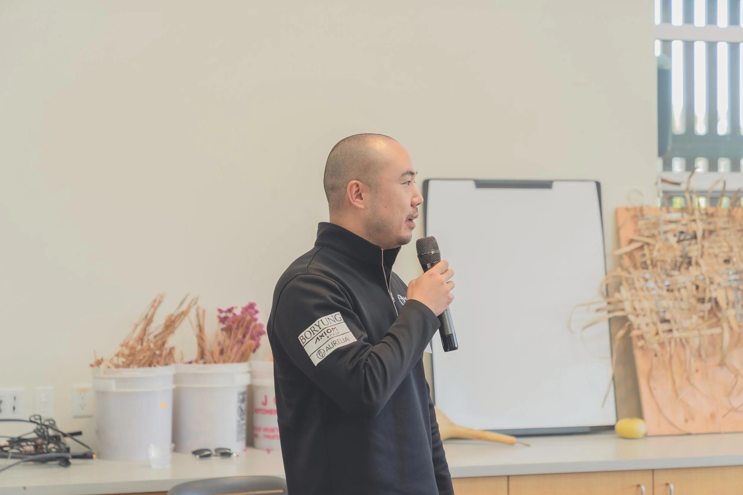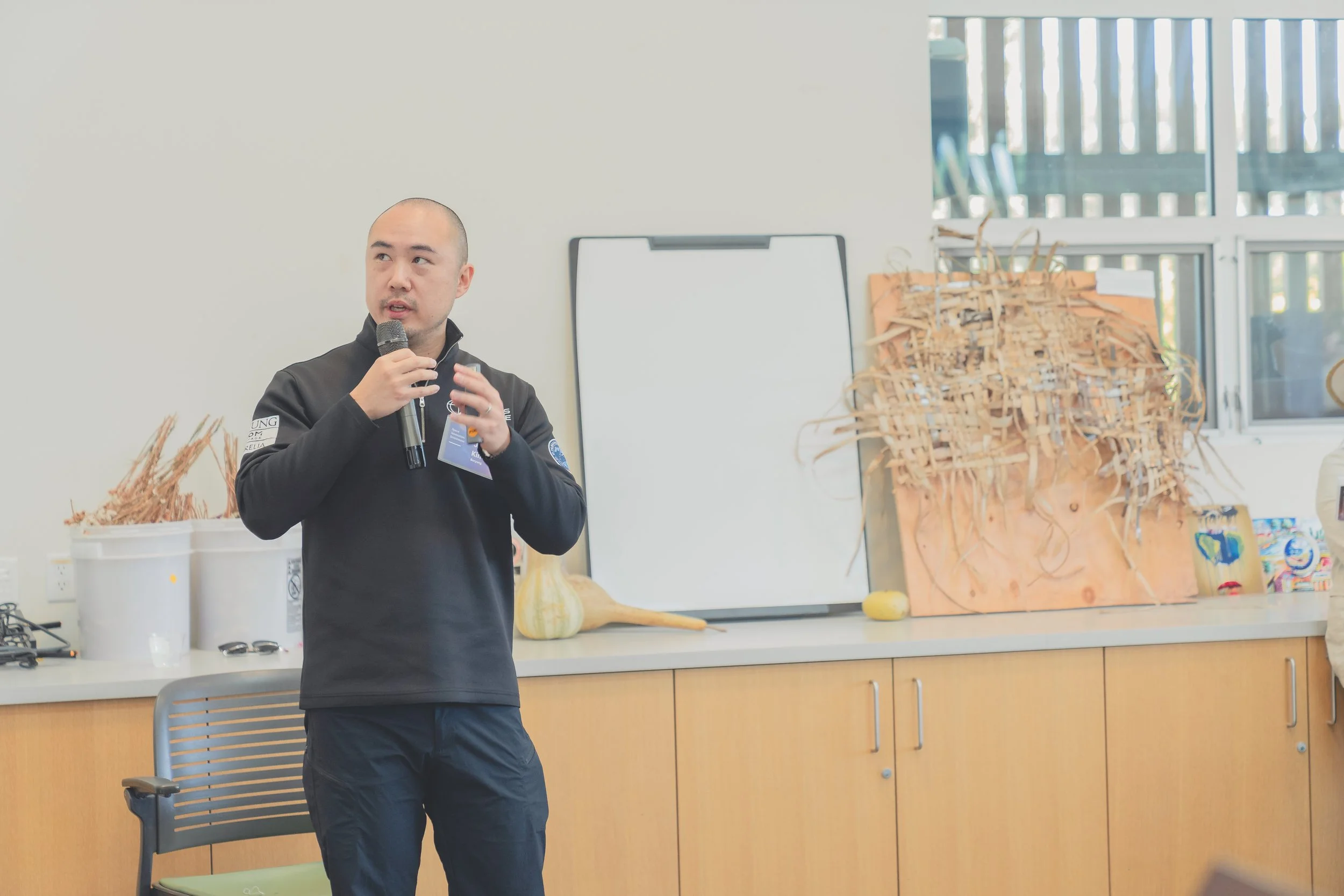 Man in black jacket speaking into a microphone in a classroom setting, with a flip chart, woven materials, and containers in the background.