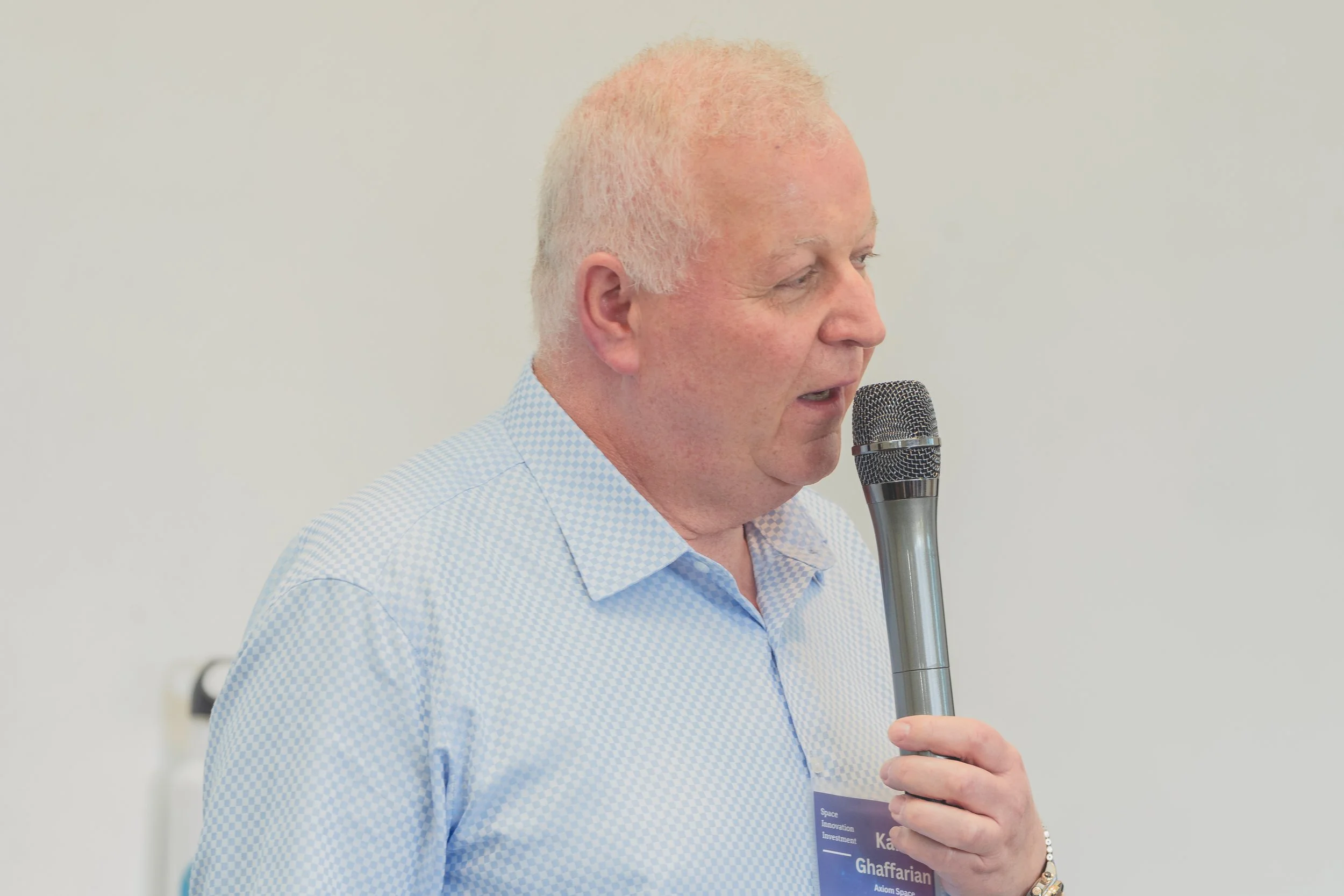 Person holding a microphone speaking in a conference setting, wearing a jacket with "Humans in Space" logo and a name badge.
